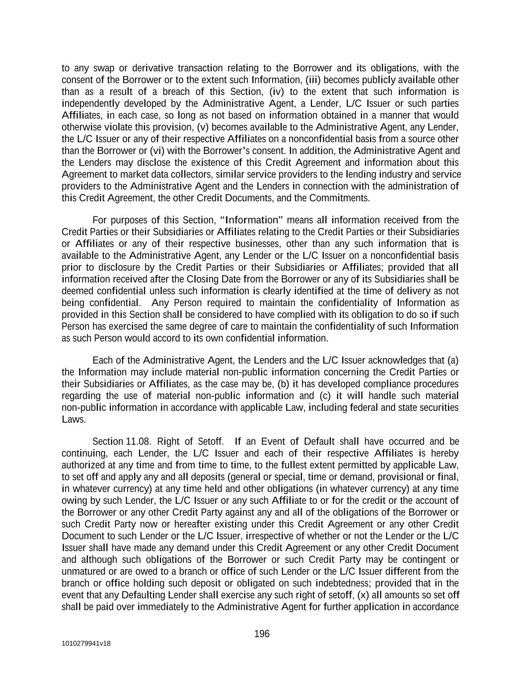 to any swap or derivative transaction relating to the Borrower and its obligations, with the consent of the Borrower or to the extent such Information, (iii) becomes publicly available other than as a result of a breach of this Section, (iv) to the extent that such information is independently developed by the Administrative Agent, a Lender, L/C Issuer or such parties Affiliates, in each case, so long as not based on information obtained in a manner that would otherwise violate this provision, (v) becomes available to the Administrative Agent, any Lender, the L/C Issuer or any of their respective Affiliates on a nonconfidential basis from a source other than the Borrower or (vi) with the Borrower’s consent. In addition, the Administrative Agent and the Lenders may disclose the existence of this Credit Agreement and information about this Agreement to market data collectors, similar service providers to the lending industry and service providers to the Administrative Agent and the Lenders in connection with the administration of this Credit Agreement, the other Credit Documents, and the Commitments. For purposes of this Section, “Information” means all information received from the Credit Parties or their Subsidiaries or Affiliates relating to the Credit Parties or their Subsidiaries or Affiliates or any of their respective businesses, other than any such information that is available to the Administrative Agent, any Lender or the L/C Issuer on a nonconfidential basis prior to disclosure by the Credit Parties or their Subsidiaries or Affiliates; provided that all information received after the Closing Date from the Borrower or any of its Subsidiaries shall be deemed confidential unless such information is clearly identified at the time of delivery as not being confidential. Any Person required to maintain the confidentiality of Information as provided in this Section shall be considered to have complied with its obligation to do so if such Person has exercised the same degree of care to maintain the confidentiality of such Information as such Person would accord to its own confidential information. Each of the Administrative Agent, the Lenders and the L/C Issuer acknowledges that (a) the Information may include material non-public information concerning the Credit Parties or their Subsidiaries or Affiliates, as the case may be, (b) it has developed compliance procedures regarding the use of material non-public information and (c) it will handle such material non-public information in accordance with applicable Law, including federal and state securities Laws. Section 11.08. Right of Setoff. If an Event of Default shall have occurred and be continuing, each Lender, the L/C Issuer and each of their respective Affiliates is hereby authorized at any time and from time to time, to the fullest extent permitted by applicable Law, to set off and apply any and all deposits (general or special, time or demand, provisional or final, in whatever currency) at any time held and other obligations (in whatever currency) at any time owing by such Lender, the L/C Issuer or any such Affiliate to or for the credit or the account of the Borrower or any other Credit Party against any and all of the obligations of the Borrower or such Credit Party now or hereafter existing under this Credit Agreement or any other Credit Document to such Lender or the L/C Issuer, irrespective of whether or not the Lender or the L/C Issuer shall have made any demand under this Credit Agreement or any other Credit Document and although such obligations of the Borrower or such Credit Party may be contingent or unmatured or are owed to a branch or office of such Lender or the L/C Issuer different from the branch or office holding such deposit or obligated on such indebtedness; provided that in the event that any Defaulting Lender shall exercise any such right of setoff, (x) all amounts so set off shall be paid over immediately to the Administrative Agent for further application in accordance 196 1010279941v18