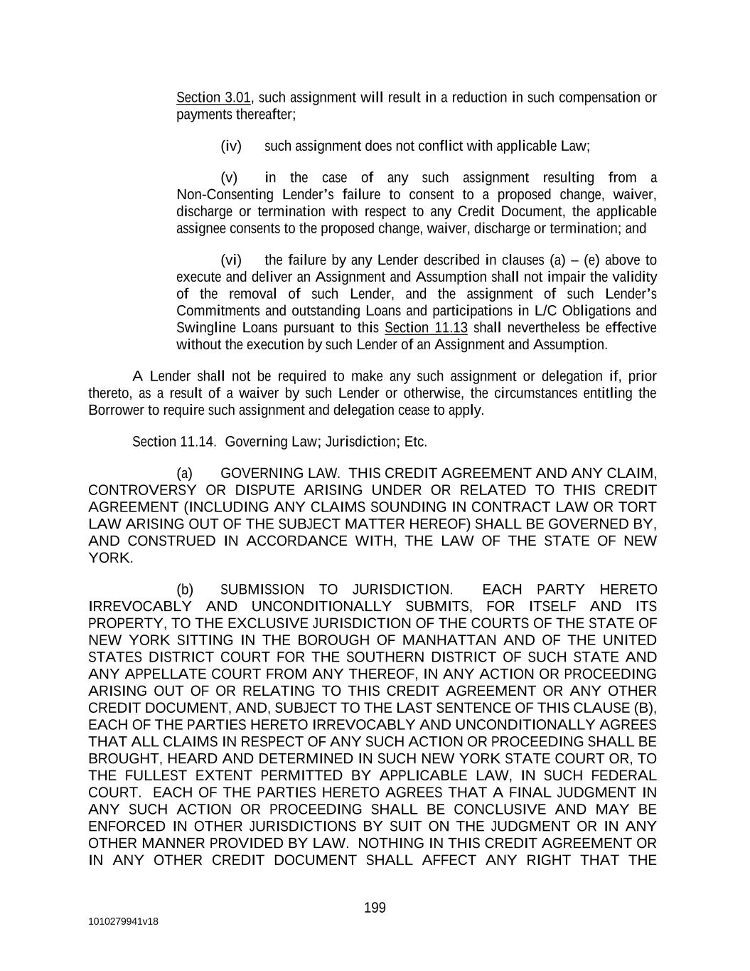 Section 3.01, such assignment will result in a reduction in such compensation or payments thereafter; (iv) such assignment does not conflict with applicable Law; (v) in the case of any such assignment resulting from a Non-Consenting Lender’s failure to consent to a proposed change, waiver, discharge or termination with respect to any Credit Document, the applicable assignee consents to the proposed change, waiver, discharge or termination; and (vi) the failure by any Lender described in clauses (a) – (e) above to execute and deliver an Assignment and Assumption shall not impair the validity of the removal of such Lender, and the assignment of such Lender’s Commitments and outstanding Loans and participations in L/C Obligations and Swingline Loans pursuant to this Section 11.13 shall nevertheless be effective without the execution by such Lender of an Assignment and Assumption. A Lender shall not be required to make any such assignment or delegation if, prior thereto, as a result of a waiver by such Lender or otherwise, the circumstances entitling the Borrower to require such assignment and delegation cease to apply. Section 11.14. Governing Law; Jurisdiction; Etc. (a) GOVERNING LAW. THIS CREDIT AGREEMENT AND ANY CLAIM, CONTROVERSY OR DISPUTE ARISING UNDER OR RELATED TO THIS CREDIT AGREEMENT (INCLUDING ANY CLAIMS SOUNDING IN CONTRACT LAW OR TORT LAW ARISING OUT OF THE SUBJECT MATTER HEREOF) SHALL BE GOVERNED BY, AND CONSTRUED IN ACCORDANCE WITH, THE LAW OF THE STATE OF NEW YORK. (b) SUBMISSION TO JURISDICTION. EACH PARTY HERETO IRREVOCABLY AND UNCONDITIONALLY SUBMITS, FOR ITSELF AND ITS PROPERTY, TO THE EXCLUSIVE JURISDICTION OF THE COURTS OF THE STATE OF NEW YORK SITTING IN THE BOROUGH OF MANHATTAN AND OF THE UNITED STATES DISTRICT COURT FOR THE SOUTHERN DISTRICT OF SUCH STATE AND ANY APPELLATE COURT FROM ANY THEREOF, IN ANY ACTION OR PROCEEDING ARISING OUT OF OR RELATING TO THIS CREDIT AGREEMENT OR ANY OTHER CREDIT DOCUMENT, AND, SUBJECT TO THE LAST SENTENCE OF THIS CLAUSE (B), EACH OF THE PARTIES HERETO IRREVOCABLY AND UNCONDITIONALLY AGREES THAT ALL CLAIMS IN RESPECT OF ANY SUCH ACTION OR PROCEEDING SHALL BE BROUGHT, HEARD AND DETERMINED IN SUCH NEW YORK STATE COURT OR, TO THE FULLEST EXTENT PERMITTED BY APPLICABLE LAW, IN SUCH FEDERAL COURT. EACH OF THE PARTIES HERETO AGREES THAT A FINAL JUDGMENT IN ANY SUCH ACTION OR PROCEEDING SHALL BE CONCLUSIVE AND MAY BE ENFORCED IN OTHER JURISDICTIONS BY SUIT ON THE JUDGMENT OR IN ANY OTHER MANNER PROVIDED BY LAW. NOTHING IN THIS CREDIT AGREEMENT OR IN ANY OTHER CREDIT DOCUMENT SHALL AFFECT ANY RIGHT THAT THE 199 1010279941v18