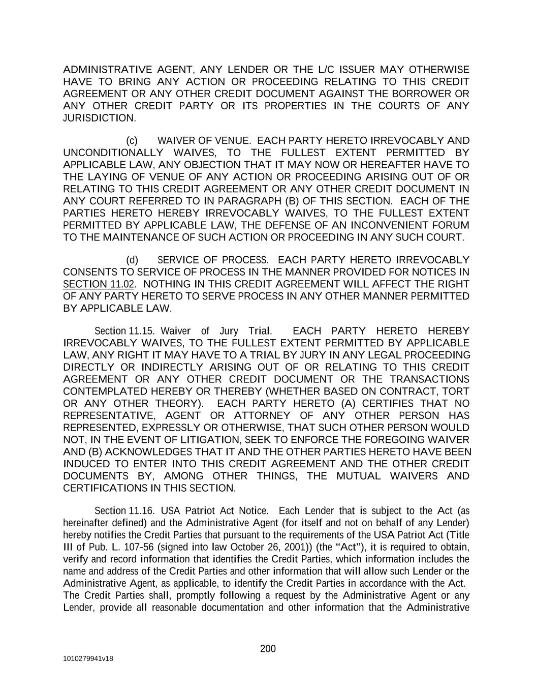 ADMINISTRATIVE AGENT, ANY LENDER OR THE L/C ISSUER MAY OTHERWISE HAVE TO BRING ANY ACTION OR PROCEEDING RELATING TO THIS CREDIT AGREEMENT OR ANY OTHER CREDIT DOCUMENT AGAINST THE BORROWER OR ANY OTHER CREDIT PARTY OR ITS PROPERTIES IN THE COURTS OF ANY JURISDICTION. (c) WAIVER OF VENUE. EACH PARTY HERETO IRREVOCABLY AND UNCONDITIONALLY WAIVES, TO THE FULLEST EXTENT PERMITTED BY APPLICABLE LAW, ANY OBJECTION THAT IT MAY NOW OR HEREAFTER HAVE TO THE LAYING OF VENUE OF ANY ACTION OR PROCEEDING ARISING OUT OF OR RELATING TO THIS CREDIT AGREEMENT OR ANY OTHER CREDIT DOCUMENT IN ANY COURT REFERRED TO IN PARAGRAPH (B) OF THIS SECTION. EACH OF THE PARTIES HERETO HEREBY IRREVOCABLY WAIVES, TO THE FULLEST EXTENT PERMITTED BY APPLICABLE LAW, THE DEFENSE OF AN INCONVENIENT FORUM TO THE MAINTENANCE OF SUCH ACTION OR PROCEEDING IN ANY SUCH COURT. (d) SERVICE OF PROCESS. EACH PARTY HERETO IRREVOCABLY CONSENTS TO SERVICE OF PROCESS IN THE MANNER PROVIDED FOR NOTICES IN SECTION 11.02. NOTHING IN THIS CREDIT AGREEMENT WILL AFFECT THE RIGHT OF ANY PARTY HERETO TO SERVE PROCESS IN ANY OTHER MANNER PERMITTED BY APPLICABLE LAW. Section 11.15. Waiver of Jury Trial. EACH PARTY HERETO HEREBY IRREVOCABLY WAIVES, TO THE FULLEST EXTENT PERMITTED BY APPLICABLE LAW, ANY RIGHT IT MAY HAVE TO A TRIAL BY JURY IN ANY LEGAL PROCEEDING DIRECTLY OR INDIRECTLY ARISING OUT OF OR RELATING TO THIS CREDIT AGREEMENT OR ANY OTHER CREDIT DOCUMENT OR THE TRANSACTIONS CONTEMPLATED HEREBY OR THEREBY (WHETHER BASED ON CONTRACT, TORT OR ANY OTHER THEORY). EACH PARTY HERETO (A) CERTIFIES THAT NO REPRESENTATIVE, AGENT OR ATTORNEY OF ANY OTHER PERSON HAS REPRESENTED, EXPRESSLY OR OTHERWISE, THAT SUCH OTHER PERSON WOULD NOT, IN THE EVENT OF LITIGATION, SEEK TO ENFORCE THE FOREGOING WAIVER AND (B) ACKNOWLEDGES THAT IT AND THE OTHER PARTIES HERETO HAVE BEEN INDUCED TO ENTER INTO THIS CREDIT AGREEMENT AND THE OTHER CREDIT DOCUMENTS BY, AMONG OTHER THINGS, THE MUTUAL WAIVERS AND CERTIFICATIONS IN THIS SECTION. Section 11.16. USA Patriot Act Notice. Each Lender that is subject to the Act (as hereinafter defined) and the Administrative Agent (for itself and not on behalf of any Lender) hereby notifies the Credit Parties that pursuant to the requirements of the USA Patriot Act (Title III of Pub. L. 107-56 (signed into law October 26, 2001)) (the “Act”), it is required to obtain, verify and record information that identifies the Credit Parties, which information includes the name and address of the Credit Parties and other information that will allow such Lender or the Administrative Agent, as applicable, to identify the Credit Parties in accordance with the Act. The Credit Parties shall, promptly following a request by the Administrative Agent or any Lender, provide all reasonable documentation and other information that the Administrative 200 1010279941v18