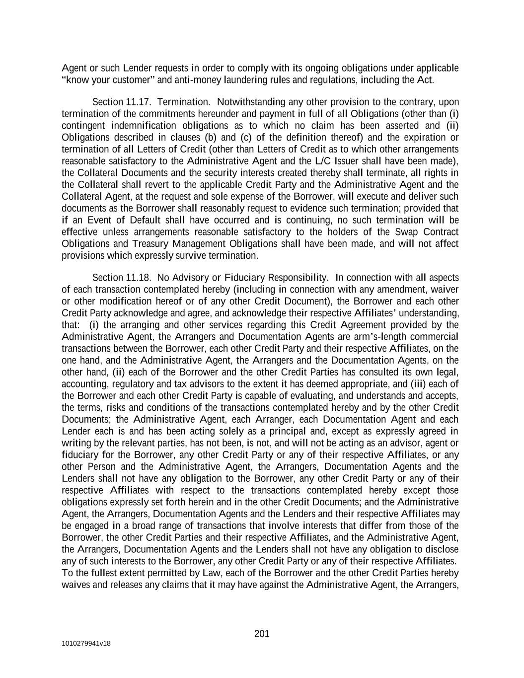 Agent or such Lender requests in order to comply with its ongoing obligations under applicable “know your customer” and anti-money laundering rules and regulations, including the Act. Section 11.17. Termination. Notwithstanding any other provision to the contrary, upon termination of the commitments hereunder and payment in full of all Obligations (other than (i) contingent indemnification obligations as to which no claim has been asserted and (ii) Obligations described in clauses (b) and (c) of the definition thereof) and the expiration or termination of all Letters of Credit (other than Letters of Credit as to which other arrangements reasonable satisfactory to the Administrative Agent and the L/C Issuer shall have been made), the Collateral Documents and the security interests created thereby shall terminate, all rights in the Collateral shall revert to the applicable Credit Party and the Administrative Agent and the Collateral Agent, at the request and sole expense of the Borrower, will execute and deliver such documents as the Borrower shall reasonably request to evidence such termination; provided that if an Event of Default shall have occurred and is continuing, no such termination will be effective unless arrangements reasonable satisfactory to the holders of the Swap Contract Obligations and Treasury Management Obligations shall have been made, and will not affect provisions which expressly survive termination. Section 11.18. No Advisory or Fiduciary Responsibility. In connection with all aspects of each transaction contemplated hereby (including in connection with any amendment, waiver or other modification hereof or of any other Credit Document), the Borrower and each other Credit Party acknowledge and agree, and acknowledge their respective Affiliates’ understanding, that: (i) the arranging and other services regarding this Credit Agreement provided by the Administrative Agent, the Arrangers and Documentation Agents are arm’s-length commercial transactions between the Borrower, each other Credit Party and their respective Affiliates, on the one hand, and the Administrative Agent, the Arrangers and the Documentation Agents, on the other hand, (ii) each of the Borrower and the other Credit Parties has consulted its own legal, accounting, regulatory and tax advisors to the extent it has deemed appropriate, and (iii) each of the Borrower and each other Credit Party is capable of evaluating, and understands and accepts, the terms, risks and conditions of the transactions contemplated hereby and by the other Credit Documents; the Administrative Agent, each Arranger, each Documentation Agent and each Lender each is and has been acting solely as a principal and, except as expressly agreed in writing by the relevant parties, has not been, is not, and will not be acting as an advisor, agent or fiduciary for the Borrower, any other Credit Party or any of their respective Affiliates, or any other Person and the Administrative Agent, the Arrangers, Documentation Agents and the Lenders shall not have any obligation to the Borrower, any other Credit Party or any of their respective Affiliates with respect to the transactions contemplated hereby except those obligations expressly set forth herein and in the other Credit Documents; and the Administrative Agent, the Arrangers, Documentation Agents and the Lenders and their respective Affiliates may be engaged in a broad range of transactions that involve interests that differ from those of the Borrower, the other Credit Parties and their respective Affiliates, and the Administrative Agent, the Arrangers, Documentation Agents and the Lenders shall not have any obligation to disclose any of such interests to the Borrower, any other Credit Party or any of their respective Affiliates. To the fullest extent permitted by Law, each of the Borrower and the other Credit Parties hereby waives and releases any claims that it may have against the Administrative Agent, the Arrangers, 201 1010279941v18