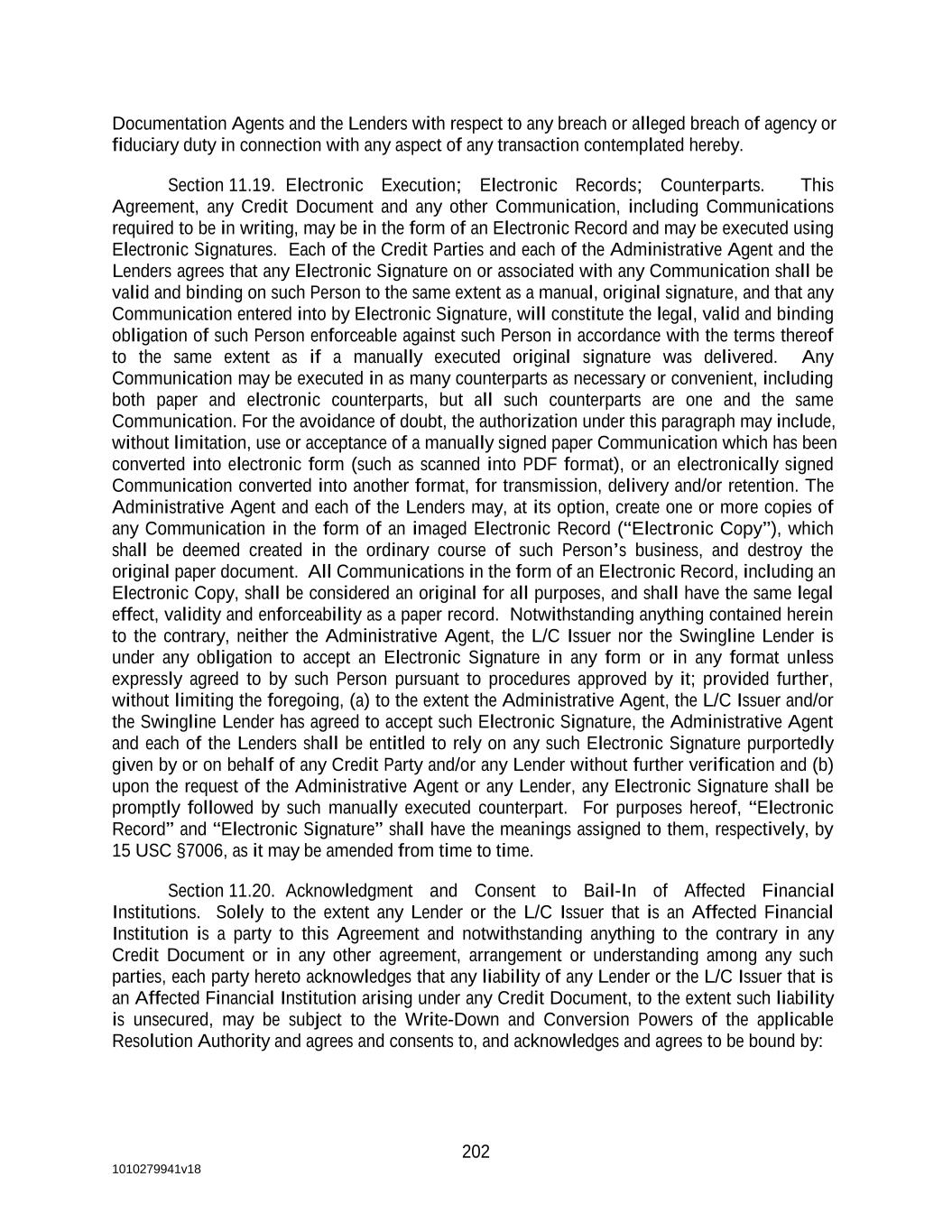 Documentation Agents and the Lenders with respect to any breach or alleged breach of agency or fiduciary duty in connection with any aspect of any transaction contemplated hereby. Section 11.19. Electronic Execution; Electronic Records; Counterparts. This Agreement, any Credit Document and any other Communication, including Communications required to be in writing, may be in the form of an Electronic Record and may be executed using Electronic Signatures. Each of the Credit Parties and each of the Administrative Agent and the Lenders agrees that any Electronic Signature on or associated with any Communication shall be valid and binding on such Person to the same extent as a manual, original signature, and that any Communication entered into by Electronic Signature, will constitute the legal, valid and binding obligation of such Person enforceable against such Person in accordance with the terms thereof to the same extent as if a manually executed original signature was delivered. Any Communication may be executed in as many counterparts as necessary or convenient, including both paper and electronic counterparts, but all such counterparts are one and the same Communication. For the avoidance of doubt, the authorization under this paragraph may include, without limitation, use or acceptance of a manually signed paper Communication which has been converted into electronic form (such as scanned into PDF format), or an electronically signed Communication converted into another format, for transmission, delivery and/or retention. The Administrative Agent and each of the Lenders may, at its option, create one or more copies of any Communication in the form of an imaged Electronic Record (“Electronic Copy”), which shall be deemed created in the ordinary course of such Person’s business, and destroy the original paper document. All Communications in the form of an Electronic Record, including an Electronic Copy, shall be considered an original for all purposes, and shall have the same legal effect, validity and enforceability as a paper record. Notwithstanding anything contained herein to the contrary, neither the Administrative Agent, the L/C Issuer nor the Swingline Lender is under any obligation to accept an Electronic Signature in any form or in any format unless expressly agreed to by such Person pursuant to procedures approved by it; provided further, without limiting the foregoing, (a) to the extent the Administrative Agent, the L/C Issuer and/or the Swingline Lender has agreed to accept such Electronic Signature, the Administrative Agent and each of the Lenders shall be entitled to rely on any such Electronic Signature purportedly given by or on behalf of any Credit Party and/or any Lender without further verification and (b) upon the request of the Administrative Agent or any Lender, any Electronic Signature shall be promptly followed by such manually executed counterpart. For purposes hereof, “Electronic Record” and “Electronic Signature” shall have the meanings assigned to them, respectively, by 15 USC §7006, as it may be amended from time to time. Section 11.20. Acknowledgment and Consent to Bail-In of Affected Financial Institutions. Solely to the extent any Lender or the L/C Issuer that is an Affected Financial Institution is a party to this Agreement and notwithstanding anything to the contrary in any Credit Document or in any other agreement, arrangement or understanding among any such parties, each party hereto acknowledges that any liability of any Lender or the L/C Issuer that is an Affected Financial Institution arising under any Credit Document, to the extent such liability is unsecured, may be subject to the Write-Down and Conversion Powers of the applicable Resolution Authority and agrees and consents to, and acknowledges and agrees to be bound by: 202 1010279941v18