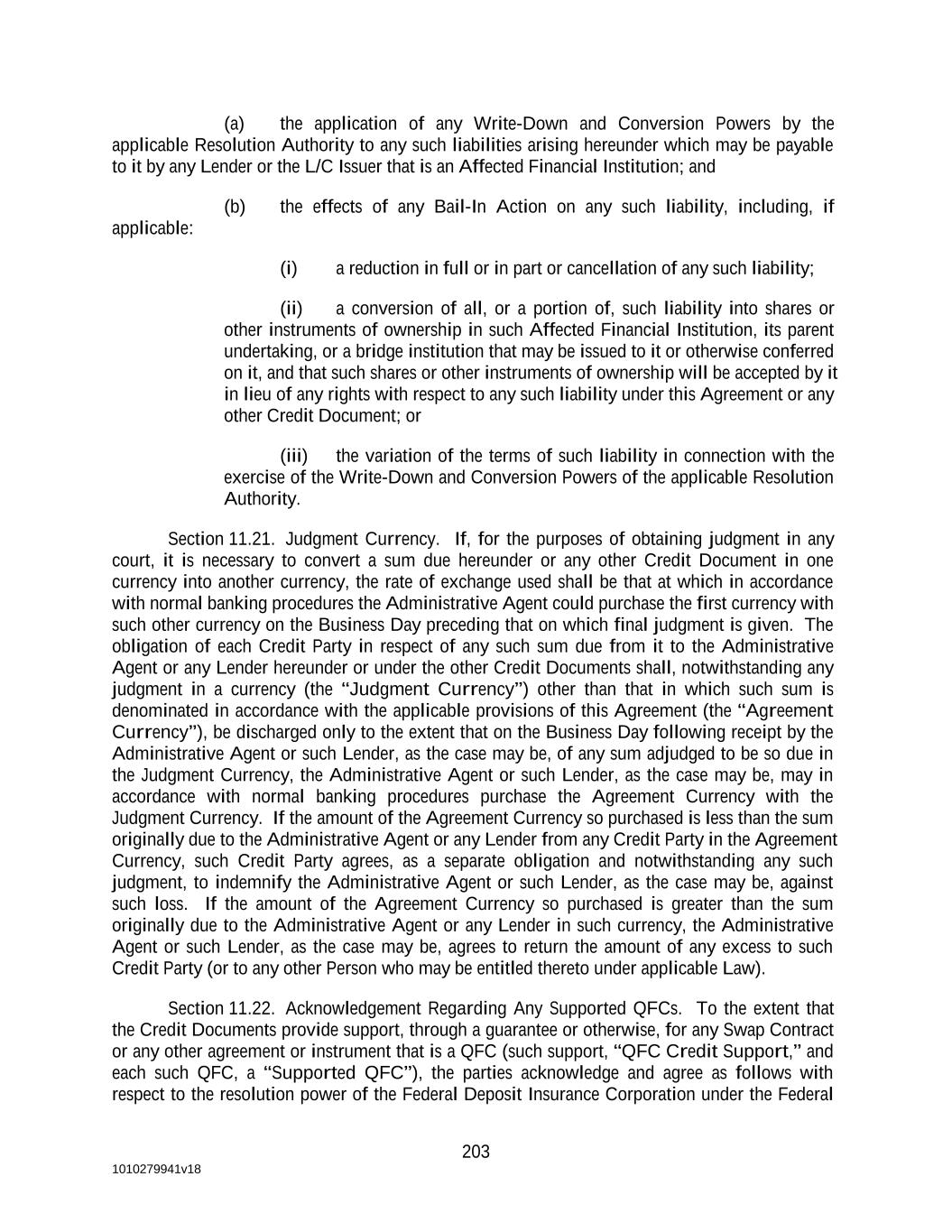 (a) the application of any Write-Down and Conversion Powers by the applicable Resolution Authority to any such liabilities arising hereunder which may be payable to it by any Lender or the L/C Issuer that is an Affected Financial Institution; and (b) the effects of any Bail-In Action on any such liability, including, if applicable: (i) a reduction in full or in part or cancellation of any such liability; (ii) a conversion of all, or a portion of, such liability into shares or other instruments of ownership in such Affected Financial Institution, its parent undertaking, or a bridge institution that may be issued to it or otherwise conferred on it, and that such shares or other instruments of ownership will be accepted by it in lieu of any rights with respect to any such liability under this Agreement or any other Credit Document; or (iii) the variation of the terms of such liability in connection with the exercise of the Write-Down and Conversion Powers of the applicable Resolution Authority. Section 11.21. Judgment Currency. If, for the purposes of obtaining judgment in any court, it is necessary to convert a sum due hereunder or any other Credit Document in one currency into another currency, the rate of exchange used shall be that at which in accordance with normal banking procedures the Administrative Agent could purchase the first currency with such other currency on the Business Day preceding that on which final judgment is given. The obligation of each Credit Party in respect of any such sum due from it to the Administrative Agent or any Lender hereunder or under the other Credit Documents shall, notwithstanding any judgment in a currency (the “Judgment Currency”) other than that in which such sum is denominated in accordance with the applicable provisions of this Agreement (the “Agreement Currency”), be discharged only to the extent that on the Business Day following receipt by the Administrative Agent or such Lender, as the case may be, of any sum adjudged to be so due in the Judgment Currency, the Administrative Agent or such Lender, as the case may be, may in accordance with normal banking procedures purchase the Agreement Currency with the Judgment Currency. If the amount of the Agreement Currency so purchased is less than the sum originally due to the Administrative Agent or any Lender from any Credit Party in the Agreement Currency, such Credit Party agrees, as a separate obligation and notwithstanding any such judgment, to indemnify the Administrative Agent or such Lender, as the case may be, against such loss. If the amount of the Agreement Currency so purchased is greater than the sum originally due to the Administrative Agent or any Lender in such currency, the Administrative Agent or such Lender, as the case may be, agrees to return the amount of any excess to such Credit Party (or to any other Person who may be entitled thereto under applicable Law). Section 11.22. Acknowledgement Regarding Any Supported QFCs. To the extent that the Credit Documents provide support, through a guarantee or otherwise, for any Swap Contract or any other agreement or instrument that is a QFC (such support, “QFC Credit Support,” and each such QFC, a “Supported QFC”), the parties acknowledge and agree as follows with respect to the resolution power of the Federal Deposit Insurance Corporation under the Federal 203 1010279941v18