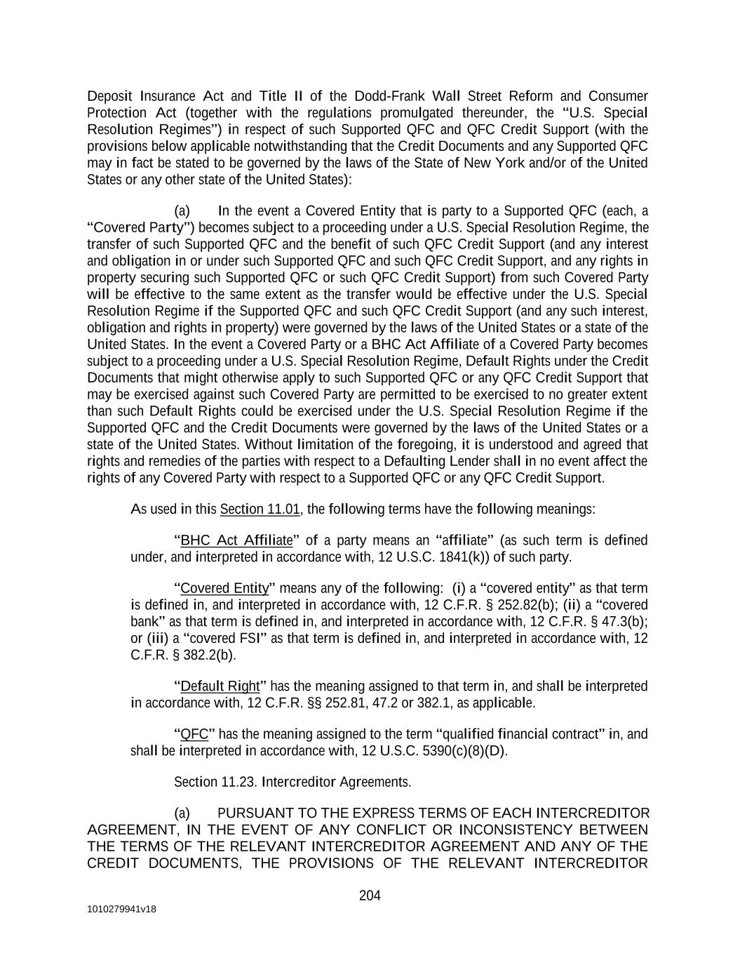 Deposit Insurance Act and Title II of the Dodd-Frank Wall Street Reform and Consumer Protection Act (together with the regulations promulgated thereunder, the “U.S. Special Resolution Regimes”) in respect of such Supported QFC and QFC Credit Support (with the provisions below applicable notwithstanding that the Credit Documents and any Supported QFC may in fact be stated to be governed by the laws of the State of New York and/or of the United States or any other state of the United States): (a) In the event a Covered Entity that is party to a Supported QFC (each, a “Covered Party”) becomes subject to a proceeding under a U.S. Special Resolution Regime, the transfer of such Supported QFC and the benefit of such QFC Credit Support (and any interest and obligation in or under such Supported QFC and such QFC Credit Support, and any rights in property securing such Supported QFC or such QFC Credit Support) from such Covered Party will be effective to the same extent as the transfer would be effective under the U.S. Special Resolution Regime if the Supported QFC and such QFC Credit Support (and any such interest, obligation and rights in property) were governed by the laws of the United States or a state of the United States. In the event a Covered Party or a BHC Act Affiliate of a Covered Party becomes subject to a proceeding under a U.S. Special Resolution Regime, Default Rights under the Credit Documents that might otherwise apply to such Supported QFC or any QFC Credit Support that may be exercised against such Covered Party are permitted to be exercised to no greater extent than such Default Rights could be exercised under the U.S. Special Resolution Regime if the Supported QFC and the Credit Documents were governed by the laws of the United States or a state of the United States. Without limitation of the foregoing, it is understood and agreed that rights and remedies of the parties with respect to a Defaulting Lender shall in no event affect the rights of any Covered Party with respect to a Supported QFC or any QFC Credit Support. As used in this Section 11.01, the following terms have the following meanings: “BHC Act Affiliate” of a party means an “affiliate” (as such term is defined under, and interpreted in accordance with, 12 U.S.C. 1841(k)) of such party. “Covered Entity” means any of the following: (i) a “covered entity” as that term is defined in, and interpreted in accordance with, 12 C.F.R. § 252.82(b); (ii) a “covered bank” as that term is defined in, and interpreted in accordance with, 12 C.F.R. § 47.3(b); or (iii) a “covered FSI” as that term is defined in, and interpreted in accordance with, 12 C.F.R. § 382.2(b). “Default Right” has the meaning assigned to that term in, and shall be interpreted in accordance with, 12 C.F.R. §§ 252.81, 47.2 or 382.1, as applicable. “QFC” has the meaning assigned to the term “qualified financial contract” in, and shall be interpreted in accordance with, 12 U.S.C. 5390(c)(8)(D). Section 11.23. Intercreditor Agreements. (a) PURSUANT TO THE EXPRESS TERMS OF EACH INTERCREDITOR AGREEMENT, IN THE EVENT OF ANY CONFLICT OR INCONSISTENCY BETWEEN THE TERMS OF THE RELEVANT INTERCREDITOR AGREEMENT AND ANY OF THE CREDIT DOCUMENTS, THE PROVISIONS OF THE RELEVANT INTERCREDITOR 204 1010279941v18