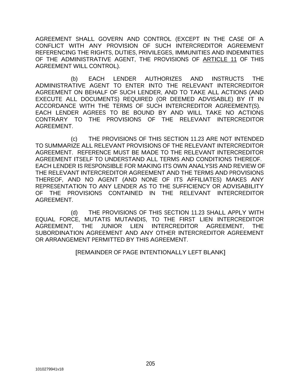 AGREEMENT SHALL GOVERN AND CONTROL (EXCEPT IN THE CASE OF A CONFLICT WITH ANY PROVISION OF SUCH INTERCREDITOR AGREEMENT REFERENCING THE RIGHTS, DUTIES, PRIVILEGES, IMMUNITIES AND INDEMNITIES OF THE ADMINISTRATIVE AGENT, THE PROVISIONS OF ARTICLE 11 OF THIS AGREEMENT WILL CONTROL). (b) EACH LENDER AUTHORIZES AND INSTRUCTS THE ADMINISTRATIVE AGENT TO ENTER INTO THE RELEVANT INTERCREDITOR AGREEMENT ON BEHALF OF SUCH LENDER, AND TO TAKE ALL ACTIONS (AND EXECUTE ALL DOCUMENTS) REQUIRED (OR DEEMED ADVISABLE) BY IT IN ACCORDANCE WITH THE TERMS OF SUCH INTERCREDITOR AGREEMENT(S). EACH LENDER AGREES TO BE BOUND BY AND WILL TAKE NO ACTIONS CONTRARY TO THE PROVISIONS OF THE RELEVANT INTERCREDITOR AGREEMENT. (c) THE PROVISIONS OF THIS SECTION 11.23 ARE NOT INTENDED TO SUMMARIZE ALL RELEVANT PROVISIONS OF THE RELEVANT INTERCREDITOR AGREEMENT. REFERENCE MUST BE MADE TO THE RELEVANT INTERCREDITOR AGREEMENT ITSELF TO UNDERSTAND ALL TERMS AND CONDITIONS THEREOF. EACH LENDER IS RESPONSIBLE FOR MAKING ITS OWN ANALYSIS AND REVIEW OF THE RELEVANT INTERCREDITOR AGREEMENT AND THE TERMS AND PROVISIONS THEREOF, AND NO AGENT (AND NONE OF ITS AFFILIATES) MAKES ANY REPRESENTATION TO ANY LENDER AS TO THE SUFFICIENCY OR ADVISABILITY OF THE PROVISIONS CONTAINED IN THE RELEVANT INTERCREDITOR AGREEMENT. (d) THE PROVISIONS OF THIS SECTION 11.23 SHALL APPLY WITH EQUAL FORCE, MUTATIS MUTANDIS, TO THE FIRST LIEN INTERCREDITOR AGREEMENT, THE JUNIOR LIEN INTERCREDITOR AGREEMENT, THE SUBORDINATION AGREEMENT AND ANY OTHER INTERCREDITOR AGREEMENT OR ARRANGEMENT PERMITTED BY THIS AGREEMENT. [REMAINDER OF PAGE INTENTIONALLY LEFT BLANK] 205 1010279941v18