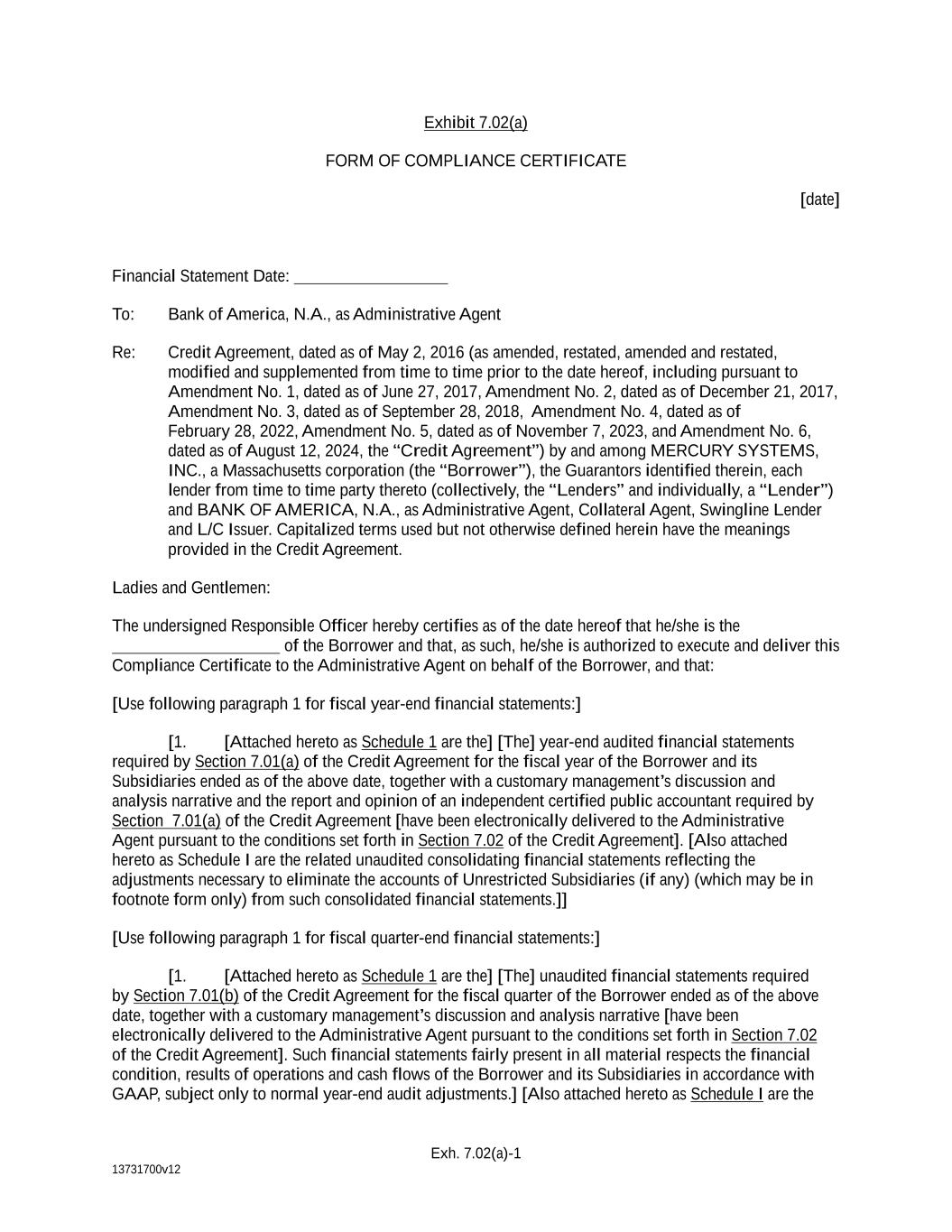 Exh. 7.02(a)-1 13731700v12 Exhibit 7.02(a) FORM OF COMPLIANCE CERTIFICATE [date] Financial Statement Date: To: Bank of America, N.A., as Administrative Agent Re: Credit Agreement, dated as of May 2, 2016 (as amended, restated, amended and restated, modified and supplemented from time to time prior to the date hereof, including pursuant to Amendment No. 1, dated as of June 27, 2017, Amendment No. 2, dated as of December 21, 2017, Amendment No. 3, dated as of September 28, 2018, Amendment No. 4, dated as of February 28, 2022, Amendment No. 5, dated as of November 7, 2023, and Amendment No. 6, dated as of August 12, 2024, the “Credit Agreement”) by and among MERCURY SYSTEMS, INC., a Massachusetts corporation (the “Borrower”), the Guarantors identified therein, each lender from time to time party thereto (collectively, the “Lenders” and individually, a “Lender”) and BANK OF AMERICA, N.A., as Administrative Agent, Collateral Agent, Swingline Lender and L/C Issuer. Capitalized terms used but not otherwise defined herein have the meanings provided in the Credit Agreement. Ladies and Gentlemen: The undersigned Responsible Officer hereby certifies as of the date hereof that he/she is the of the Borrower and that, as such, he/she is authorized to execute and deliver this Compliance Certificate to the Administrative Agent on behalf of the Borrower, and that: [Use following paragraph 1 for fiscal year-end financial statements:] [1. [Attached hereto as Schedule 1 are the] [The] year-end audited financial statements required by Section 7.01(a) of the Credit Agreement for the fiscal year of the Borrower and its Subsidiaries ended as of the above date, together with a customary management’s discussion and analysis narrative and the report and opinion of an independent certified public accountant required by Section 7.01(a) of the Credit Agreement [have been electronically delivered to the Administrative Agent pursuant to the conditions set forth in Section 7.02 of the Credit Agreement]. [Also attached hereto as Schedule I are the related unaudited consolidating financial statements reflecting the adjustments necessary to eliminate the accounts of Unrestricted Subsidiaries (if any) (which may be in footnote form only) from such consolidated financial statements.]] [Use following paragraph 1 for fiscal quarter-end financial statements:] [1. [Attached hereto as Schedule 1 are the] [The] unaudited financial statements required by Section 7.01(b) of the Credit Agreement for the fiscal quarter of the Borrower ended as of the above date, together with a customary management’s discussion and analysis narrative [have been electronically delivered to the Administrative Agent pursuant to the conditions set forth in Section 7.02 of the Credit Agreement]. Such financial statements fairly present in all material respects the financial condition, results of operations and cash flows of the Borrower and its Subsidiaries in accordance with GAAP, subject only to normal year-end audit adjustments.] [Also attached hereto as Schedule I are the