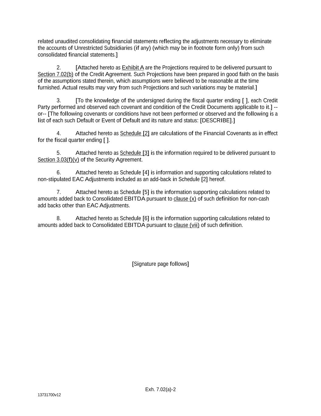 Exh. 7.02(a)-2 13731700v12 related unaudited consolidating financial statements reflecting the adjustments necessary to eliminate the accounts of Unrestricted Subsidiaries (if any) (which may be in footnote form only) from such consolidated financial statements.] 2. [Attached hereto as Exhibit A are the Projections required to be delivered pursuant to Section 7.02(b) of the Credit Agreement. Such Projections have been prepared in good faith on the basis of the assumptions stated therein, which assumptions were believed to be reasonable at the time furnished. Actual results may vary from such Projections and such variations may be material.] 3. [To the knowledge of the undersigned during the fiscal quarter ending [ ], each Credit Party performed and observed each covenant and condition of the Credit Documents applicable to it.] -- or-- [The following covenants or conditions have not been performed or observed and the following is a list of each such Default or Event of Default and its nature and status: [DESCRIBE].] 4. Attached hereto as Schedule [2] are calculations of the Financial Covenants as in effect for the fiscal quarter ending [ ]. 5. Attached hereto as Schedule [3] is the information required to be delivered pursuant to Section 3.03(f)(v) of the Security Agreement. 6. Attached hereto as Schedule [4] is information and supporting calculations related to non-stipulated EAC Adjustments included as an add-back in Schedule [2] hereof. 7. Attached hereto as Schedule [5] is the information supporting calculations related to amounts added back to Consolidated EBITDA pursuant to clause (x) of such definition for non-cash add backs other than EAC Adjustments. 8. Attached hereto as Schedule [6] is the information supporting calculations related to amounts added back to Consolidated EBITDA pursuant to clause (vii) of such definition. [Signature page follows]