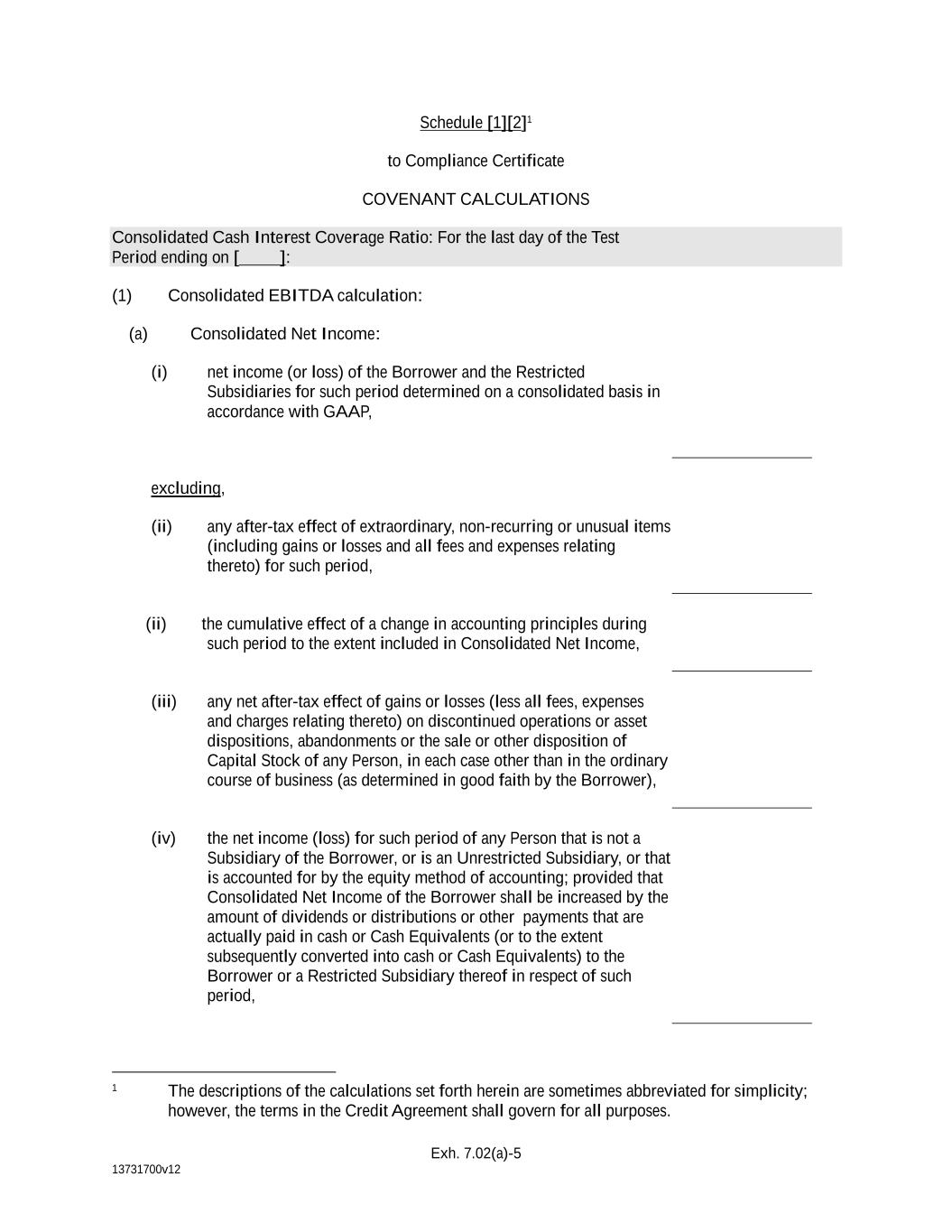 Exh. 7.02(a)-5 13731700v12 Schedule [1][2]1 to Compliance Certificate COVENANT CALCULATIONS Consolidated Cash Interest Coverage Ratio: For the last day of the Test Period ending on [ ]: (1) Consolidated EBITDA calculation: (a) Consolidated Net Income: (i) net income (or loss) of the Borrower and the Restricted Subsidiaries for such period determined on a consolidated basis in accordance with GAAP, excluding, (ii) any after-tax effect of extraordinary, non-recurring or unusual items (including gains or losses and all fees and expenses relating thereto) for such period, (ii) the cumulative effect of a change in accounting principles during such period to the extent included in Consolidated Net Income, (iii) any net after-tax effect of gains or losses (less all fees, expenses and charges relating thereto) on discontinued operations or asset dispositions, abandonments or the sale or other disposition of Capital Stock of any Person, in each case other than in the ordinary course of business (as determined in good faith by the Borrower), (iv) the net income (loss) for such period of any Person that is not a Subsidiary of the Borrower, or is an Unrestricted Subsidiary, or that is accounted for by the equity method of accounting; provided that Consolidated Net Income of the Borrower shall be increased by the amount of dividends or distributions or other payments that are actually paid in cash or Cash Equivalents (or to the extent subsequently converted into cash or Cash Equivalents) to the Borrower or a Restricted Subsidiary thereof in respect of such period, 1 The descriptions of the calculations set forth herein are sometimes abbreviated for simplicity; however, the terms in the Credit Agreement shall govern for all purposes.