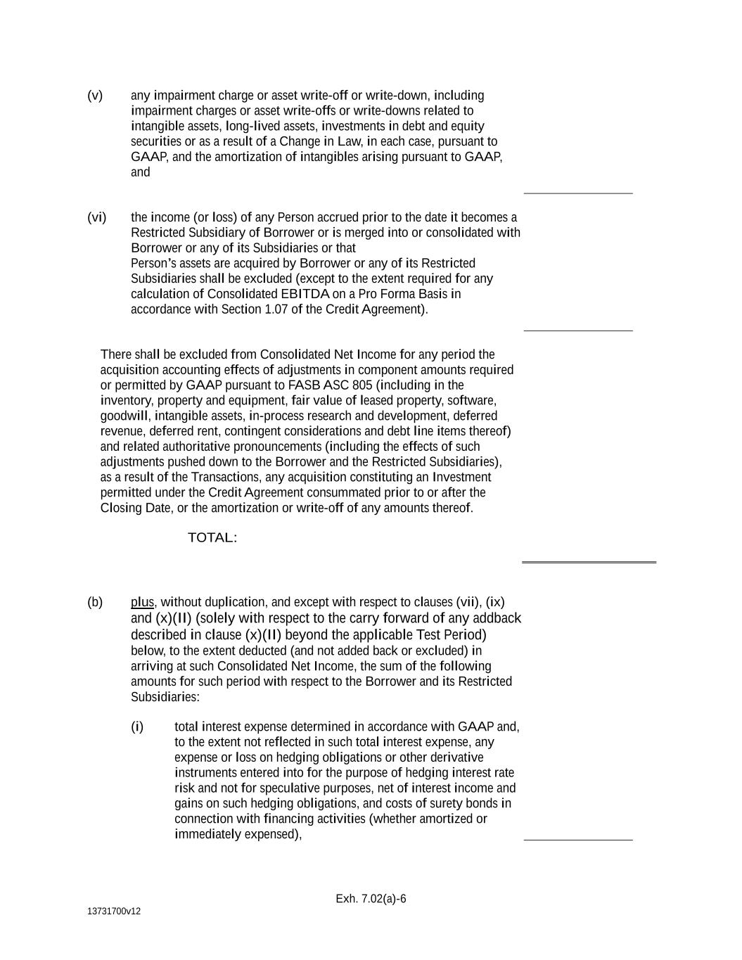 Exh. 7.02(a)-6 13731700v12 (v) any impairment charge or asset write-off or write-down, including impairment charges or asset write-offs or write-downs related to intangible assets, long-lived assets, investments in debt and equity securities or as a result of a Change in Law, in each case, pursuant to GAAP, and the amortization of intangibles arising pursuant to GAAP, and (vi) the income (or loss) of any Person accrued prior to the date it becomes a Restricted Subsidiary of Borrower or is merged into or consolidated with Borrower or any of its Subsidiaries or that Person’s assets are acquired by Borrower or any of its Restricted Subsidiaries shall be excluded (except to the extent required for any calculation of Consolidated EBITDA on a Pro Forma Basis in accordance with Section 1.07 of the Credit Agreement). There shall be excluded from Consolidated Net Income for any period the acquisition accounting effects of adjustments in component amounts required or permitted by GAAP pursuant to FASB ASC 805 (including in the inventory, property and equipment, fair value of leased property, software, goodwill, intangible assets, in-process research and development, deferred revenue, deferred rent, contingent considerations and debt line items thereof) and related authoritative pronouncements (including the effects of such adjustments pushed down to the Borrower and the Restricted Subsidiaries), as a result of the Transactions, any acquisition constituting an Investment permitted under the Credit Agreement consummated prior to or after the Closing Date, or the amortization or write-off of any amounts thereof. TOTAL: (b) plus, without duplication, and except with respect to clauses (vii), (ix) and (x)(II) (solely with respect to the carry forward of any addback described in clause (x)(II) beyond the applicable Test Period) below, to the extent deducted (and not added back or excluded) in arriving at such Consolidated Net Income, the sum of the following amounts for such period with respect to the Borrower and its Restricted Subsidiaries: (i) total interest expense determined in accordance with GAAP and, to the extent not reflected in such total interest expense, any expense or loss on hedging obligations or other derivative instruments entered into for the purpose of hedging interest rate risk and not for speculative purposes, net of interest income and gains on such hedging obligations, and costs of surety bonds in connection with financing activities (whether amortized or immediately expensed),