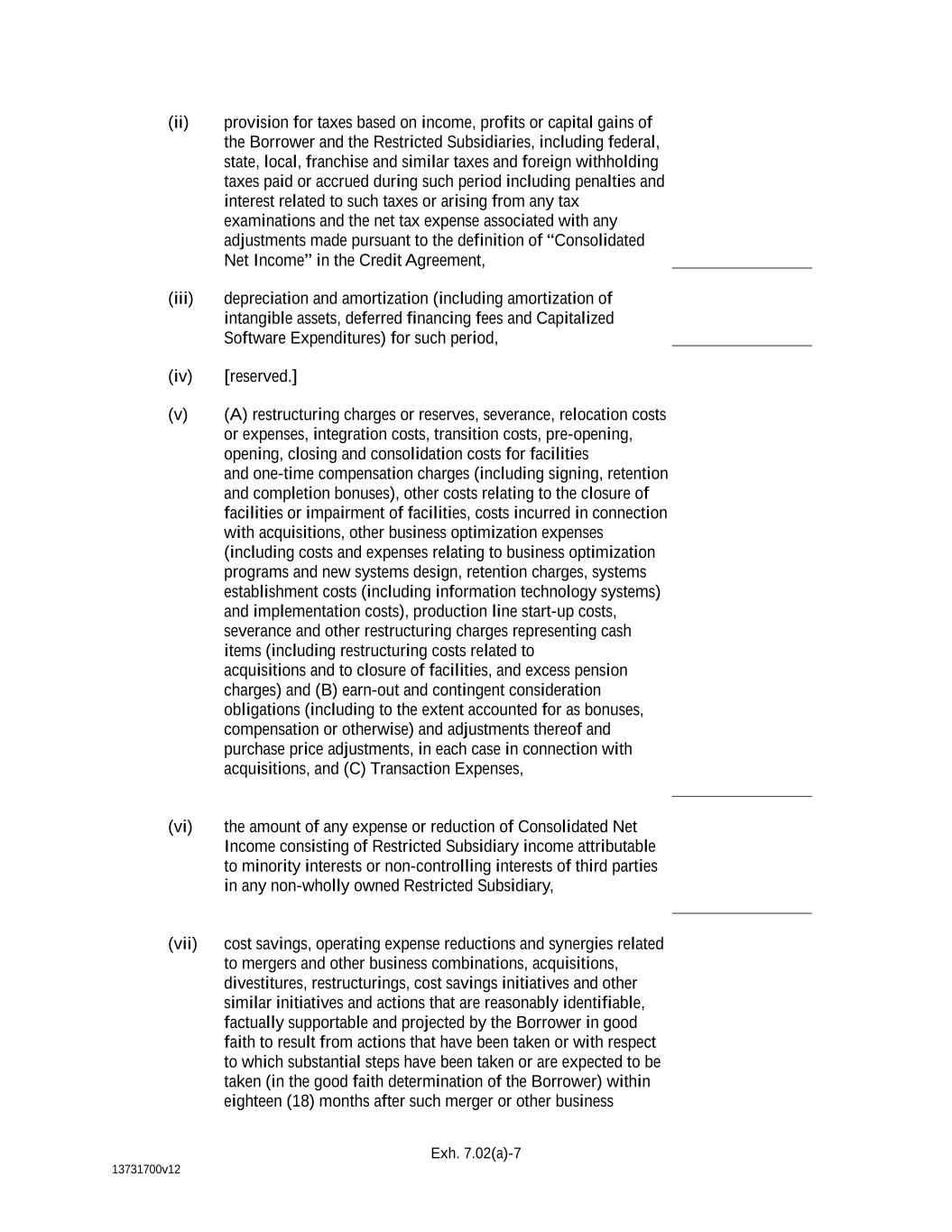 Exh. 7.02(a)-7 13731700v12 (ii) provision for taxes based on income, profits or capital gains of the Borrower and the Restricted Subsidiaries, including federal, state, local, franchise and similar taxes and foreign withholding taxes paid or accrued during such period including penalties and interest related to such taxes or arising from any tax examinations and the net tax expense associated with any adjustments made pursuant to the definition of “Consolidated Net Income” in the Credit Agreement, (iii) depreciation and amortization (including amortization of intangible assets, deferred financing fees and Capitalized Software Expenditures) for such period, (iv) [reserved.] (v) (A) restructuring charges or reserves, severance, relocation costs or expenses, integration costs, transition costs, pre-opening, opening, closing and consolidation costs for facilities and one-time compensation charges (including signing, retention and completion bonuses), other costs relating to the closure of facilities or impairment of facilities, costs incurred in connection with acquisitions, other business optimization expenses (including costs and expenses relating to business optimization programs and new systems design, retention charges, systems establishment costs (including information technology systems) and implementation costs), production line start-up costs, severance and other restructuring charges representing cash items (including restructuring costs related to acquisitions and to closure of facilities, and excess pension charges) and (B) earn-out and contingent consideration obligations (including to the extent accounted for as bonuses, compensation or otherwise) and adjustments thereof and purchase price adjustments, in each case in connection with acquisitions, and (C) Transaction Expenses, (vi) the amount of any expense or reduction of Consolidated Net Income consisting of Restricted Subsidiary income attributable to minority interests or non-controlling interests of third parties in any non-wholly owned Restricted Subsidiary, (vii) cost savings, operating expense reductions and synergies related to mergers and other business combinations, acquisitions, divestitures, restructurings, cost savings initiatives and other similar initiatives and actions that are reasonably identifiable, factually supportable and projected by the Borrower in good faith to result from actions that have been taken or with respect to which substantial steps have been taken or are expected to be taken (in the good faith determination of the Borrower) within eighteen (18) months after such merger or other business