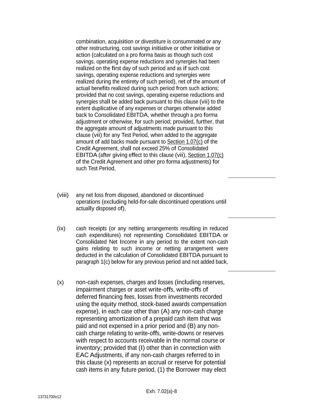 Exh. 7.02(a)-8 13731700v12 combination, acquisition or divestiture is consummated or any other restructuring, cost savings initiative or other initiative or action (calculated on a pro forma basis as though such cost savings, operating expense reductions and synergies had been realized on the first day of such period and as if such cost savings, operating expense reductions and synergies were realized during the entirety of such period), net of the amount of actual benefits realized during such period from such actions; provided that no cost savings, operating expense reductions and synergies shall be added back pursuant to this clause (vii) to the extent duplicative of any expenses or charges otherwise added back to Consolidated EBITDA, whether through a pro forma adjustment or otherwise, for such period; provided, further, that the aggregate amount of adjustments made pursuant to this clause (vii) for any Test Period, when added to the aggregate amount of add backs made pursuant to Section 1.07(c) of the Credit Agreement, shall not exceed 25% of Consolidated EBITDA (after giving effect to this clause (vii), Section 1.07(c) of the Credit Agreement and other pro forma adjustments) for such Test Period, (viii) any net loss from disposed, abandoned or discontinued operations (excluding held-for-sale discontinued operations until actually disposed of), (ix) cash receipts (or any netting arrangements resulting in reduced cash expenditures) not representing Consolidated EBITDA or Consolidated Net Income in any period to the extent non-cash gains relating to such income or netting arrangement were deducted in the calculation of Consolidated EBITDA pursuant to paragraph 1(c) below for any previous period and not added back, (x) non-cash expenses, charges and losses (including reserves, impairment charges or asset write-offs, write-offs of deferred financing fees, losses from investments recorded using the equity method, stock-based awards compensation expense), in each case other than (A) any non-cash charge representing amortization of a prepaid cash item that was paid and not expensed in a prior period and (B) any non- cash charge relating to write-offs, write-downs or reserves with respect to accounts receivable in the normal course or inventory; provided that (I) other than in connection with EAC Adjustments, if any non-cash charges referred to in this clause (x) represents an accrual or reserve for potential cash items in any future period, (1) the Borrower may elect