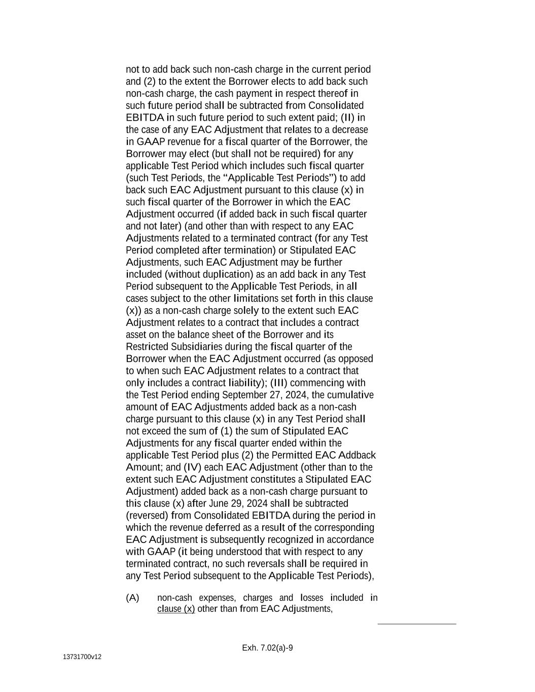 Exh. 7.02(a)-9 13731700v12 not to add back such non-cash charge in the current period and (2) to the extent the Borrower elects to add back such non-cash charge, the cash payment in respect thereof in such future period shall be subtracted from Consolidated EBITDA in such future period to such extent paid; (II) in the case of any EAC Adjustment that relates to a decrease in GAAP revenue for a fiscal quarter of the Borrower, the Borrower may elect (but shall not be required) for any applicable Test Period which includes such fiscal quarter (such Test Periods, the “Applicable Test Periods”) to add back such EAC Adjustment pursuant to this clause (x) in such fiscal quarter of the Borrower in which the EAC Adjustment occurred (if added back in such fiscal quarter and not later) (and other than with respect to any EAC Adjustments related to a terminated contract (for any Test Period completed after termination) or Stipulated EAC Adjustments, such EAC Adjustment may be further included (without duplication) as an add back in any Test Period subsequent to the Applicable Test Periods, in all cases subject to the other limitations set forth in this clause (x)) as a non-cash charge solely to the extent such EAC Adjustment relates to a contract that includes a contract asset on the balance sheet of the Borrower and its Restricted Subsidiaries during the fiscal quarter of the Borrower when the EAC Adjustment occurred (as opposed to when such EAC Adjustment relates to a contract that only includes a contract liability); (III) commencing with the Test Period ending September 27, 2024, the cumulative amount of EAC Adjustments added back as a non-cash charge pursuant to this clause (x) in any Test Period shall not exceed the sum of (1) the sum of Stipulated EAC Adjustments for any fiscal quarter ended within the applicable Test Period plus (2) the Permitted EAC Addback Amount; and (IV) each EAC Adjustment (other than to the extent such EAC Adjustment constitutes a Stipulated EAC Adjustment) added back as a non-cash charge pursuant to this clause (x) after June 29, 2024 shall be subtracted (reversed) from Consolidated EBITDA during the period in which the revenue deferred as a result of the corresponding EAC Adjustment is subsequently recognized in accordance with GAAP (it being understood that with respect to any terminated contract, no such reversals shall be required in any Test Period subsequent to the Applicable Test Periods), (A) non-cash expenses, charges and losses included in clause (x) other than from EAC Adjustments,