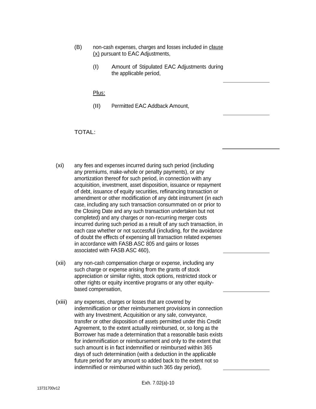 Exh. 7.02(a)-10 13731700v12 (B) non-cash expenses, charges and losses included in clause (x) pursuant to EAC Adjustments, (I) Amount of Stipulated EAC Adjustments during the applicable period, Plus: (II) Permitted EAC Addback Amount, TOTAL: (xi) any fees and expenses incurred during such period (including any premiums, make-whole or penalty payments), or any amortization thereof for such period, in connection with any acquisition, investment, asset disposition, issuance or repayment of debt, issuance of equity securities, refinancing transaction or amendment or other modification of any debt instrument (in each case, including any such transaction consummated on or prior to the Closing Date and any such transaction undertaken but not completed) and any charges or non-recurring merger costs incurred during such period as a result of any such transaction, in each case whether or not successful (including, for the avoidance of doubt the effects of expensing all transaction related expenses in accordance with FASB ASC 805 and gains or losses associated with FASB ASC 460), (xii) any non-cash compensation charge or expense, including any such charge or expense arising from the grants of stock appreciation or similar rights, stock options, restricted stock or other rights or equity incentive programs or any other equity- based compensation, (xiii) any expenses, charges or losses that are covered by indemnification or other reimbursement provisions in connection with any Investment, Acquisition or any sale, conveyance, transfer or other disposition of assets permitted under this Credit Agreement, to the extent actually reimbursed, or, so long as the Borrower has made a determination that a reasonable basis exists for indemnification or reimbursement and only to the extent that such amount is in fact indemnified or reimbursed within 365 days of such determination (with a deduction in the applicable future period for any amount so added back to the extent not so indemnified or reimbursed within such 365 day period),