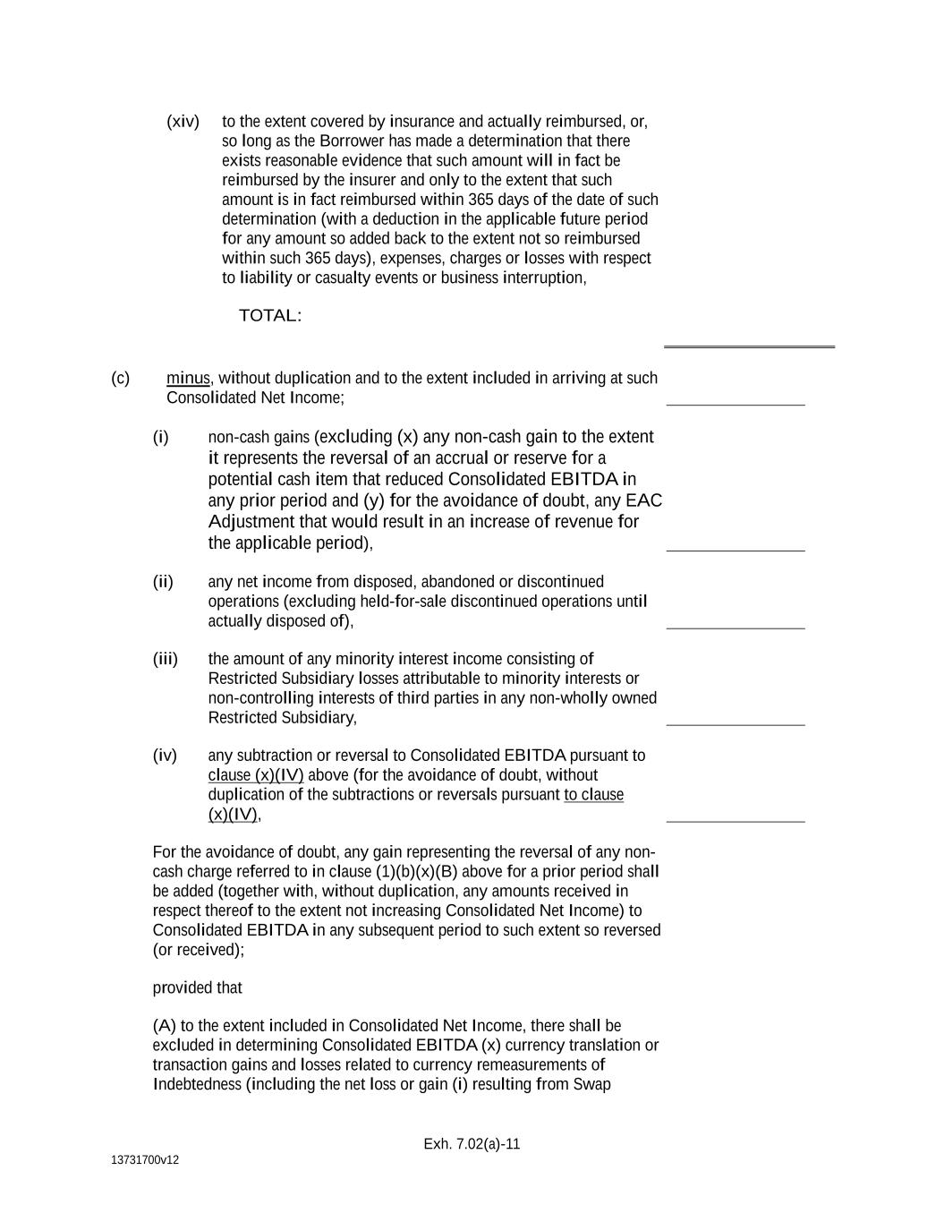 Exh. 7.02(a)-11 13731700v12 (xiv) to the extent covered by insurance and actually reimbursed, or, so long as the Borrower has made a determination that there exists reasonable evidence that such amount will in fact be reimbursed by the insurer and only to the extent that such amount is in fact reimbursed within 365 days of the date of such determination (with a deduction in the applicable future period for any amount so added back to the extent not so reimbursed within such 365 days), expenses, charges or losses with respect to liability or casualty events or business interruption, TOTAL: (c) minus, without duplication and to the extent included in arriving at such Consolidated Net Income; (i) non-cash gains (excluding (x) any non-cash gain to the extent it represents the reversal of an accrual or reserve for a potential cash item that reduced Consolidated EBITDA in any prior period and (y) for the avoidance of doubt, any EAC Adjustment that would result in an increase of revenue for the applicable period), (ii) any net income from disposed, abandoned or discontinued operations (excluding held-for-sale discontinued operations until actually disposed of), (iii) the amount of any minority interest income consisting of Restricted Subsidiary losses attributable to minority interests or non-controlling interests of third parties in any non-wholly owned Restricted Subsidiary, (iv) any subtraction or reversal to Consolidated EBITDA pursuant to clause (x)(IV) above (for the avoidance of doubt, without duplication of the subtractions or reversals pursuant to clause (x)(IV), For the avoidance of doubt, any gain representing the reversal of any non- cash charge referred to in clause (1)(b)(x)(B) above for a prior period shall be added (together with, without duplication, any amounts received in respect thereof to the extent not increasing Consolidated Net Income) to Consolidated EBITDA in any subsequent period to such extent so reversed (or received); provided that (A) to the extent included in Consolidated Net Income, there shall be excluded in determining Consolidated EBITDA (x) currency translation or transaction gains and losses related to currency remeasurements of Indebtedness (including the net loss or gain (i) resulting from Swap
