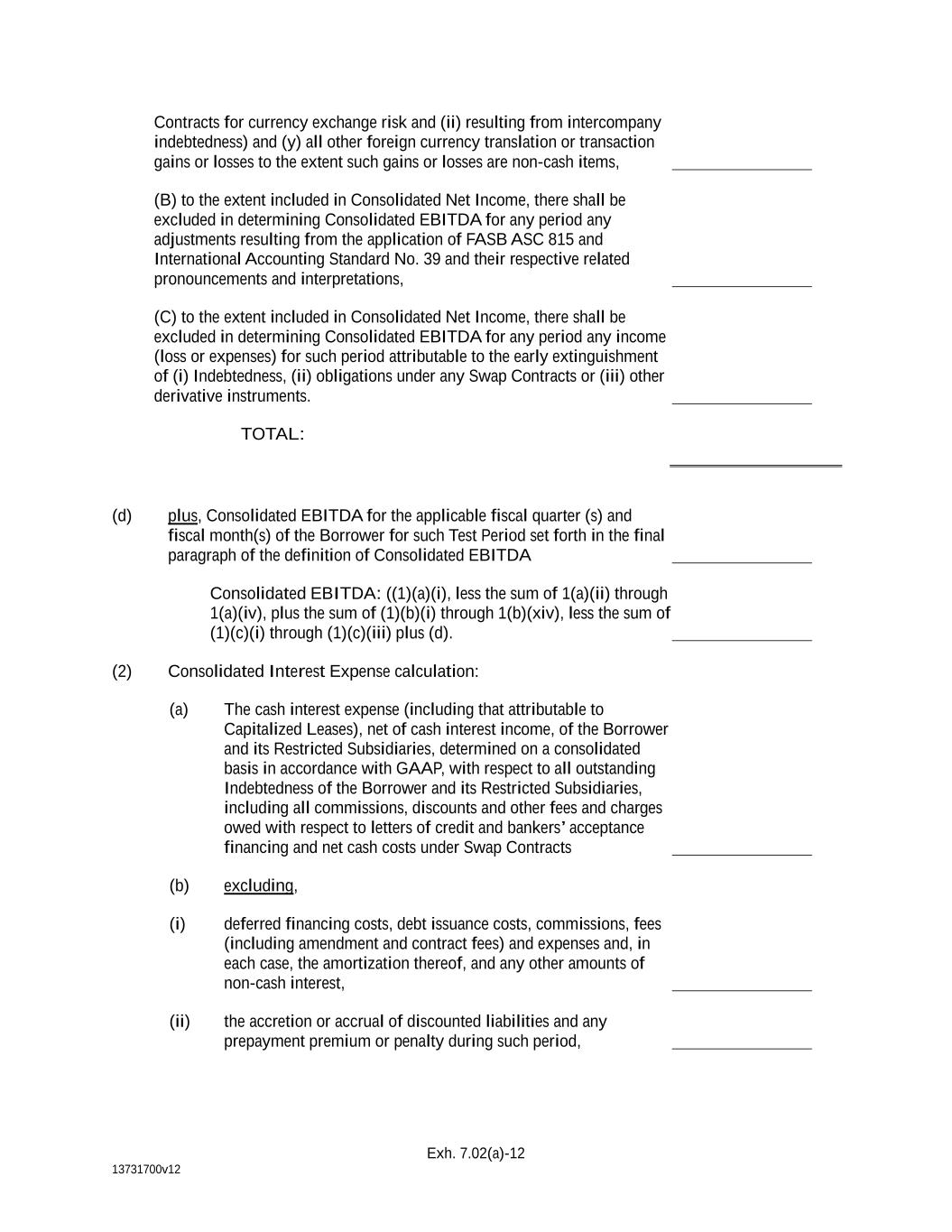 Exh. 7.02(a)-12 13731700v12 Contracts for currency exchange risk and (ii) resulting from intercompany indebtedness) and (y) all other foreign currency translation or transaction gains or losses to the extent such gains or losses are non-cash items, (B) to the extent included in Consolidated Net Income, there shall be excluded in determining Consolidated EBITDA for any period any adjustments resulting from the application of FASB ASC 815 and International Accounting Standard No. 39 and their respective related pronouncements and interpretations, (C) to the extent included in Consolidated Net Income, there shall be excluded in determining Consolidated EBITDA for any period any income (loss or expenses) for such period attributable to the early extinguishment of (i) Indebtedness, (ii) obligations under any Swap Contracts or (iii) other derivative instruments. TOTAL: (d) plus, Consolidated EBITDA for the applicable fiscal quarter (s) and fiscal month(s) of the Borrower for such Test Period set forth in the final paragraph of the definition of Consolidated EBITDA Consolidated EBITDA: ((1)(a)(i), less the sum of 1(a)(ii) through 1(a)(iv), plus the sum of (1)(b)(i) through 1(b)(xiv), less the sum of (1)(c)(i) through (1)(c)(iii) plus (d). (2) Consolidated Interest Expense calculation: (a) The cash interest expense (including that attributable to Capitalized Leases), net of cash interest income, of the Borrower and its Restricted Subsidiaries, determined on a consolidated basis in accordance with GAAP, with respect to all outstanding Indebtedness of the Borrower and its Restricted Subsidiaries, including all commissions, discounts and other fees and charges owed with respect to letters of credit and bankers’ acceptance financing and net cash costs under Swap Contracts (b) excluding, (i) deferred financing costs, debt issuance costs, commissions, fees (including amendment and contract fees) and expenses and, in each case, the amortization thereof, and any other amounts of non-cash interest, (ii) the accretion or accrual of discounted liabilities and any prepayment premium or penalty during such period,