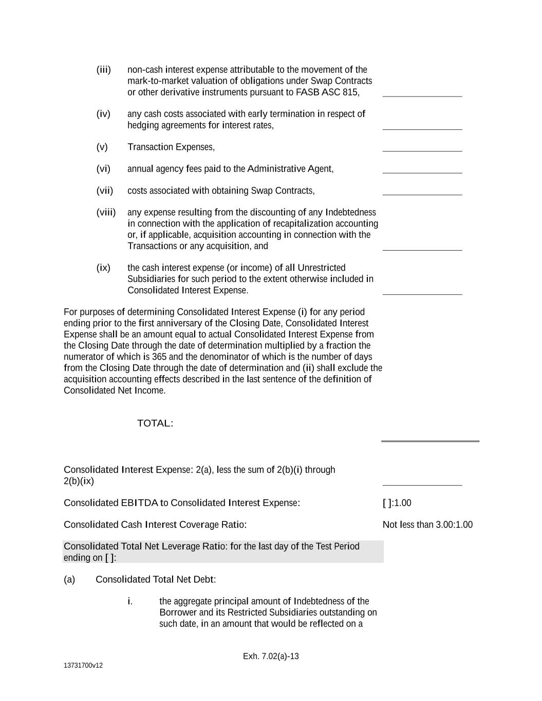 Exh. 7.02(a)-13 13731700v12 (iii) non-cash interest expense attributable to the movement of the mark-to-market valuation of obligations under Swap Contracts or other derivative instruments pursuant to FASB ASC 815, (iv) any cash costs associated with early termination in respect of hedging agreements for interest rates, (v) Transaction Expenses, (vi) annual agency fees paid to the Administrative Agent, (vii) costs associated with obtaining Swap Contracts, (viii) any expense resulting from the discounting of any Indebtedness in connection with the application of recapitalization accounting or, if applicable, acquisition accounting in connection with the Transactions or any acquisition, and (ix) the cash interest expense (or income) of all Unrestricted Subsidiaries for such period to the extent otherwise included in Consolidated Interest Expense. For purposes of determining Consolidated Interest Expense (i) for any period ending prior to the first anniversary of the Closing Date, Consolidated Interest Expense shall be an amount equal to actual Consolidated Interest Expense from the Closing Date through the date of determination multiplied by a fraction the numerator of which is 365 and the denominator of which is the number of days from the Closing Date through the date of determination and (ii) shall exclude the acquisition accounting effects described in the last sentence of the definition of Consolidated Net Income. TOTAL: Consolidated Interest Expense: 2(a), less the sum of 2(b)(i) through 2(b)(ix) Consolidated EBITDA to Consolidated Interest Expense: [ ]:1.00 Consolidated Cash Interest Coverage Ratio: Not less than 3.00:1.00 Consolidated Total Net Leverage Ratio: for the last day of the Test Period ending on [ ]: (a) Consolidated Total Net Debt: i. the aggregate principal amount of Indebtedness of the Borrower and its Restricted Subsidiaries outstanding on such date, in an amount that would be reflected on a