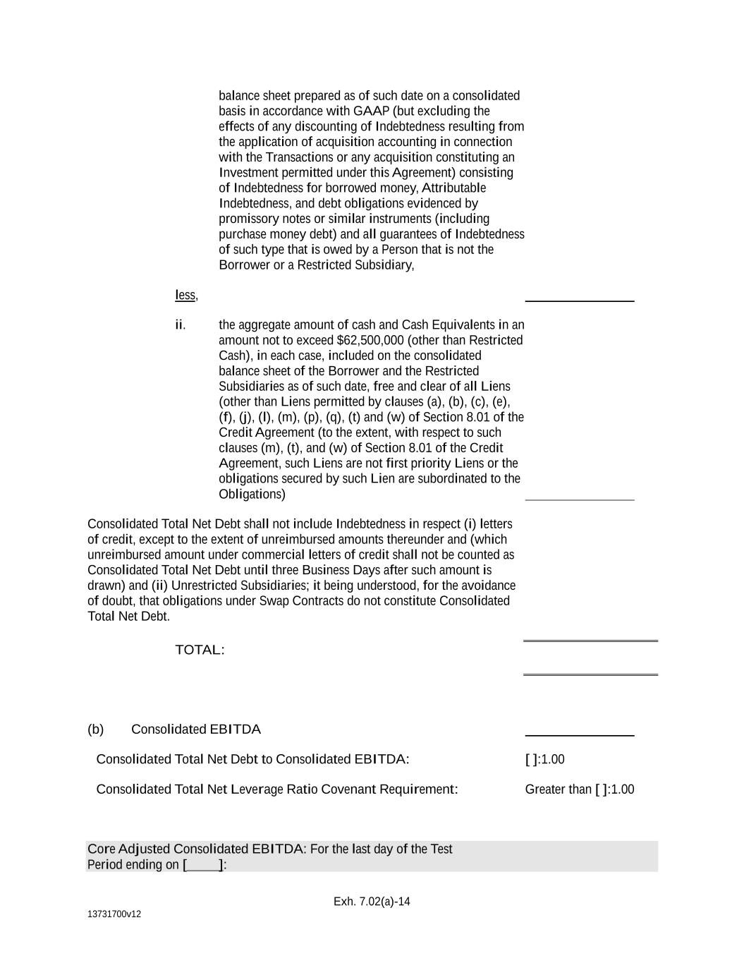 Exh. 7.02(a)-14 13731700v12 balance sheet prepared as of such date on a consolidated basis in accordance with GAAP (but excluding the effects of any discounting of Indebtedness resulting from the application of acquisition accounting in connection with the Transactions or any acquisition constituting an Investment permitted under this Agreement) consisting of Indebtedness for borrowed money, Attributable Indebtedness, and debt obligations evidenced by promissory notes or similar instruments (including purchase money debt) and all guarantees of Indebtedness of such type that is owed by a Person that is not the Borrower or a Restricted Subsidiary, less, ii. the aggregate amount of cash and Cash Equivalents in an amount not to exceed $62,500,000 (other than Restricted Cash), in each case, included on the consolidated balance sheet of the Borrower and the Restricted Subsidiaries as of such date, free and clear of all Liens (other than Liens permitted by clauses (a), (b), (c), (e), (f), (j), (l), (m), (p), (q), (t) and (w) of Section 8.01 of the Credit Agreement (to the extent, with respect to such clauses (m), (t), and (w) of Section 8.01 of the Credit Agreement, such Liens are not first priority Liens or the obligations secured by such Lien are subordinated to the Obligations) Consolidated Total Net Debt shall not include Indebtedness in respect (i) letters of credit, except to the extent of unreimbursed amounts thereunder and (which unreimbursed amount under commercial letters of credit shall not be counted as Consolidated Total Net Debt until three Business Days after such amount is drawn) and (ii) Unrestricted Subsidiaries; it being understood, for the avoidance of doubt, that obligations under Swap Contracts do not constitute Consolidated Total Net Debt. TOTAL: (b) Consolidated EBITDA Consolidated Total Net Debt to Consolidated EBITDA: [ ]:1.00 Consolidated Total Net Leverage Ratio Covenant Requirement: Greater than [ ]:1.00 Core Adjusted Consolidated EBITDA: For the last day of the Test Period ending on [ ]: