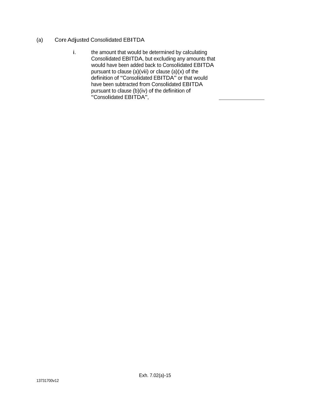 Exh. 7.02(a)-15 13731700v12 (a) Core Adjusted Consolidated EBITDA i. the amount that would be determined by calculating Consolidated EBITDA, but excluding any amounts that would have been added back to Consolidated EBITDA pursuant to clause (a)(vii) or clause (a)(x) of the definition of “Consolidated EBITDA” or that would have been subtracted from Consolidated EBITDA pursuant to clause (b)(iv) of the definition of “Consolidated EBITDA”,