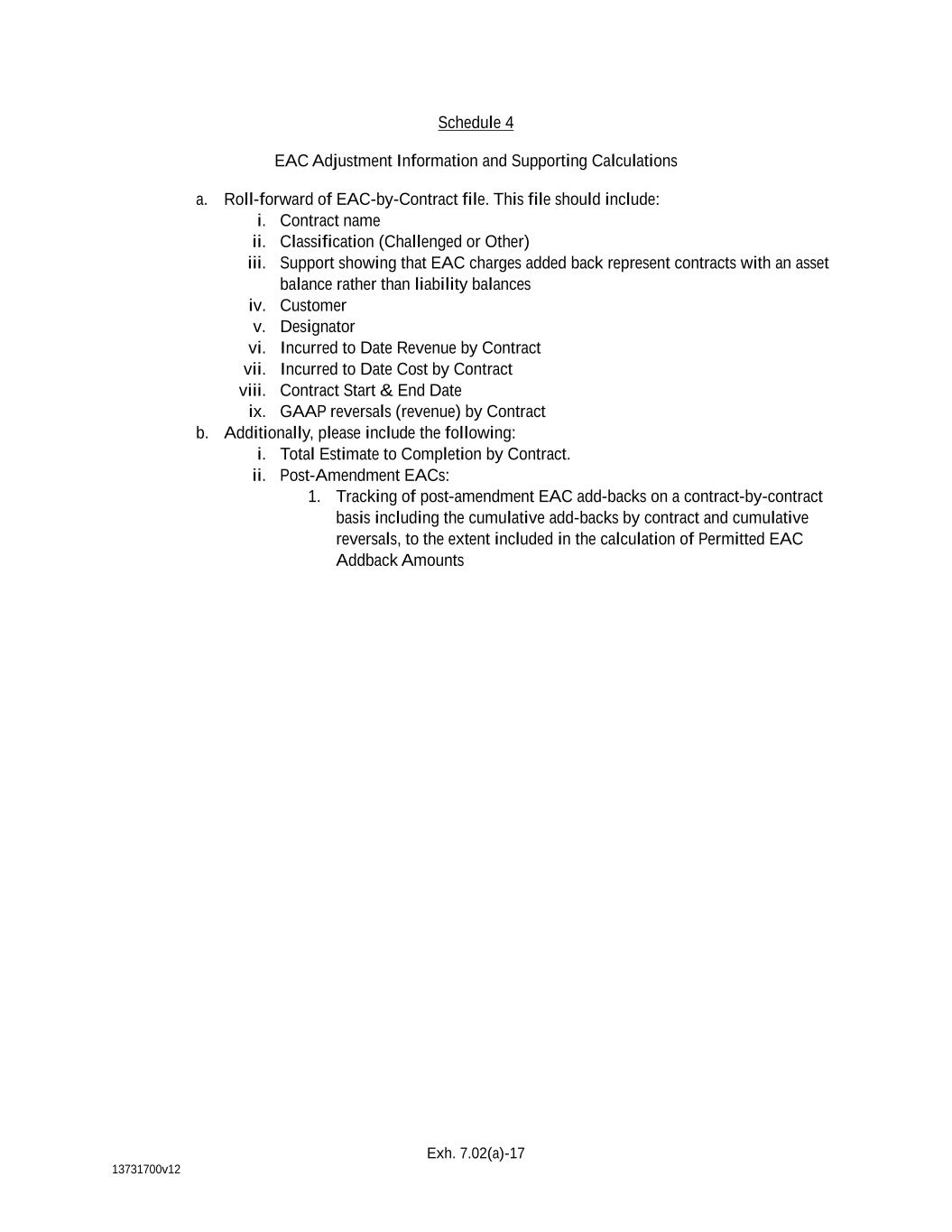 Exh. 7.02(a)-17 13731700v12 Schedule 4 EAC Adjustment Information and Supporting Calculations a. Roll-forward of EAC-by-Contract file. This file should include: i. Contract name ii. Classification (Challenged or Other) iii. Support showing that EAC charges added back represent contracts with an asset balance rather than liability balances iv. Customer v. Designator vi. Incurred to Date Revenue by Contract vii. Incurred to Date Cost by Contract viii. Contract Start & End Date ix. GAAP reversals (revenue) by Contract b. Additionally, please include the following: i. Total Estimate to Completion by Contract. ii. Post-Amendment EACs: 1. Tracking of post-amendment EAC add-backs on a contract-by-contract basis including the cumulative add-backs by contract and cumulative reversals, to the extent included in the calculation of Permitted EAC Addback Amounts