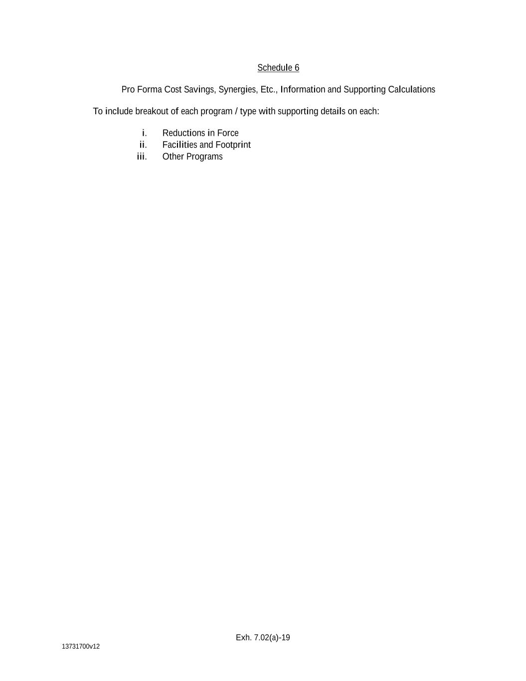 Exh. 7.02(a)-19 13731700v12 Schedule 6 Pro Forma Cost Savings, Synergies, Etc., Information and Supporting Calculations To include breakout of each program / type with supporting details on each: i. Reductions in Force ii. Facilities and Footprint iii. Other Programs