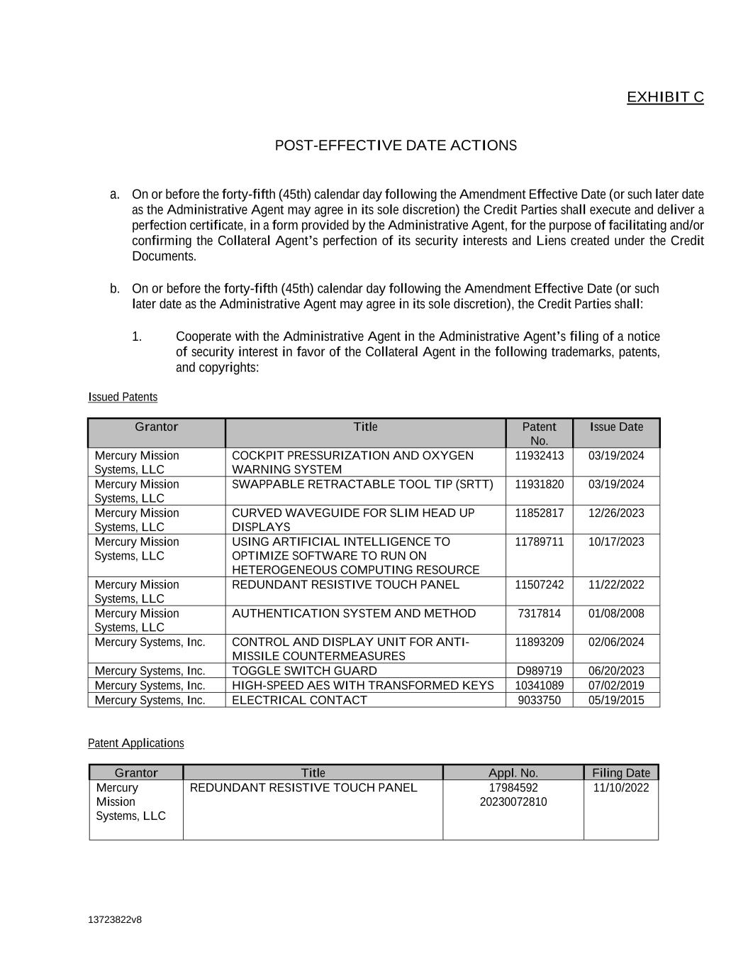 13723822v8 EXHIBIT C POST-EFFECTIVE DATE ACTIONS a. On or before the forty-fifth (45th) calendar day following the Amendment Effective Date (or such later date as the Administrative Agent may agree in its sole discretion) the Credit Parties shall execute and deliver a perfection certificate, in a form provided by the Administrative Agent, for the purpose of facilitating and/or confirming the Collateral Agent’s perfection of its security interests and Liens created under the Credit Documents. b. On or before the forty-fifth (45th) calendar day following the Amendment Effective Date (or such later date as the Administrative Agent may agree in its sole discretion), the Credit Parties shall: 1. Cooperate with the Administrative Agent in the Administrative Agent’s filing of a notice of security interest in favor of the Collateral Agent in the following trademarks, patents, and copyrights: Issued Patents Grantor Title Patent No. Issue Date Mercury Mission Systems, LLC COCKPIT PRESSURIZATION AND OXYGEN WARNING SYSTEM 11932413 03/19/2024 Mercury Mission Systems, LLC SWAPPABLE RETRACTABLE TOOL TIP (SRTT) 11931820 03/19/2024 Mercury Mission Systems, LLC CURVED WAVEGUIDE FOR SLIM HEAD UP DISPLAYS 11852817 12/26/2023 Mercury Mission Systems, LLC USING ARTIFICIAL INTELLIGENCE TO OPTIMIZE SOFTWARE TO RUN ON HETEROGENEOUS COMPUTING RESOURCE 11789711 10/17/2023 Mercury Mission Systems, LLC REDUNDANT RESISTIVE TOUCH PANEL 11507242 11/22/2022 Mercury Mission Systems, LLC AUTHENTICATION SYSTEM AND METHOD 7317814 01/08/2008 Mercury Systems, Inc. CONTROL AND DISPLAY UNIT FOR ANTI- MISSILE COUNTERMEASURES 11893209 02/06/2024 Mercury Systems, Inc. TOGGLE SWITCH GUARD D989719 06/20/2023 Mercury Systems, Inc. HIGH-SPEED AES WITH TRANSFORMED KEYS 10341089 07/02/2019 Mercury Systems, Inc. ELECTRICAL CONTACT 9033750 05/19/2015 Patent Applications Grantor Title Appl. No. Filing Date Mercury Mission Systems, LLC REDUNDANT RESISTIVE TOUCH PANEL 17984592 20230072810 11/10/2022