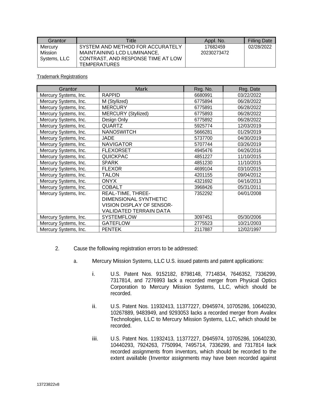 13723822v8 Grantor Title Appl. No. Filing Date Mercury Mission Systems, LLC SYSTEM AND METHOD FOR ACCURATELY MAINTAINING LCD LUMINANCE, CONTRAST, AND RESPONSE TIME AT LOW TEMPERATURES 17682459 20230273472 02/28/2022 Trademark Registrations Grantor Mark Reg. No. Reg. Date Mercury Systems, Inc. RAPPID 6680991 03/22/2022 Mercury Systems, Inc. M (Stylized) 6775894 06/28/2022 Mercury Systems, Inc. MERCURY 6775891 06/28/2022 Mercury Systems, Inc. MERCURY (Stylized) 6775893 06/28/2022 Mercury Systems, Inc. Design Only 6775892 06/28/2022 Mercury Systems, Inc. QUARTZ 5925774 12/03/2019 Mercury Systems, Inc. NANOSWITCH 5666281 01/29/2019 Mercury Systems, Inc. JADE 5737700 04/30/2019 Mercury Systems, Inc. NAVIGATOR 5707744 03/26/2019 Mercury Systems, Inc. FLEXORSET 4945476 04/26/2016 Mercury Systems, Inc. QUICKPAC 4851227 11/10/2015 Mercury Systems, Inc. SPARK 4851230 11/10/2015 Mercury Systems, Inc. FLEXOR 4699104 03/10/2015 Mercury Systems, Inc. TALON 4201155 09/04/2012 Mercury Systems, Inc. ONYX 4321692 04/16/2013 Mercury Systems, Inc. COBALT 3968426 05/31/2011 Mercury Systems, Inc. REAL-TIME, THREE- DIMENSIONAL SYNTHETIC VISION DISPLAY OF SENSOR- VALIDATED TERRAIN DATA 7352292 04/01/2008 Mercury Systems, Inc. SYSTEMFLOW 3097451 05/30/2006 Mercury Systems, Inc. GATEFLOW 2775523 10/21/2003 Mercury Systems, Inc. PENTEK 2117887 12/02/1997 2. Cause the following registration errors to be addressed: a. Mercury Mission Systems, LLC U.S. issued patents and patent applications: i. U.S. Patent Nos. 9152182, 8798148, 7714834, 7646352, 7336299, 7317814, and 7276993 lack a recorded merger from Physical Optics Corporation to Mercury Mission Systems, LLC, which should be recorded. ii. U.S. Patent Nos. 11932413, 11377227, D945974, 10705286, 10640230, 10267889, 9483949, and 9293053 lacks a recorded merger from Avalex Technologies, LLC to Mercury Mission Systems, LLC, which should be recorded. iii. U.S. Patent Nos. 11932413, 11377227, D945974, 10705286, 10640230, 10440293, 7924263, 7750994, 7495714, 7336299, and 7317814 lack recorded assignments from inventors, which should be recorded to the extent available (Inventor assignments may have been recorded against