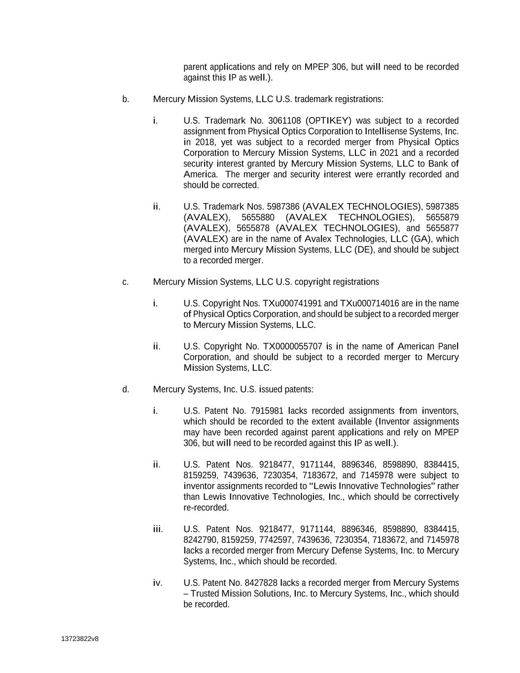 13723822v8 parent applications and rely on MPEP 306, but will need to be recorded against this IP as well.). b. Mercury Mission Systems, LLC U.S. trademark registrations: i. U.S. Trademark No. 3061108 (OPTIKEY) was subject to a recorded assignment from Physical Optics Corporation to Intellisense Systems, Inc. in 2018, yet was subject to a recorded merger from Physical Optics Corporation to Mercury Mission Systems, LLC in 2021 and a recorded security interest granted by Mercury Mission Systems, LLC to Bank of America. The merger and security interest were errantly recorded and should be corrected. ii. U.S. Trademark Nos. 5987386 (AVALEX TECHNOLOGIES), 5987385 (AVALEX), 5655880 (AVALEX TECHNOLOGIES), 5655879 (AVALEX), 5655878 (AVALEX TECHNOLOGIES), and 5655877 (AVALEX) are in the name of Avalex Technologies, LLC (GA), which merged into Mercury Mission Systems, LLC (DE), and should be subject to a recorded merger. c. Mercury Mission Systems, LLC U.S. copyright registrations i. U.S. Copyright Nos. TXu000741991 and TXu000714016 are in the name of Physical Optics Corporation, and should be subject to a recorded merger to Mercury Mission Systems, LLC. ii. U.S. Copyright No. TX0000055707 is in the name of American Panel Corporation, and should be subject to a recorded merger to Mercury Mission Systems, LLC. d. Mercury Systems, Inc. U.S. issued patents: i. U.S. Patent No. 7915981 lacks recorded assignments from inventors, which should be recorded to the extent available (Inventor assignments may have been recorded against parent applications and rely on MPEP 306, but will need to be recorded against this IP as well.). ii. U.S. Patent Nos. 9218477, 9171144, 8896346, 8598890, 8384415, 8159259, 7439636, 7230354, 7183672, and 7145978 were subject to inventor assignments recorded to “Lewis Innovative Technologies” rather than Lewis Innovative Technologies, Inc., which should be correctively re-recorded. iii. U.S. Patent Nos. 9218477, 9171144, 8896346, 8598890, 8384415, 8242790, 8159259, 7742597, 7439636, 7230354, 7183672, and 7145978 lacks a recorded merger from Mercury Defense Systems, Inc. to Mercury Systems, Inc., which should be recorded. iv. U.S. Patent No. 8427828 lacks a recorded merger from Mercury Systems – Trusted Mission Solutions, Inc. to Mercury Systems, Inc., which should be recorded.