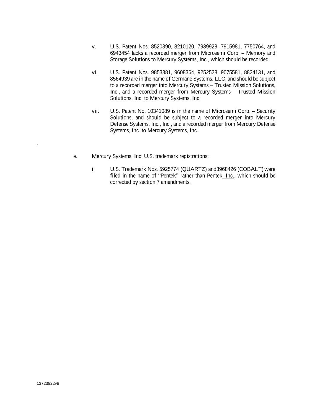 13723822v8 v. U.S. Patent Nos. 8520390, 8210120, 7939928, 7915981, 7750764, and 6943454 lacks a recorded merger from Microsemi Corp. – Memory and Storage Solutions to Mercury Systems, Inc., which should be recorded. vi. U.S. Patent Nos. 9853381, 9608364, 9252528, 9075581, 8824131, and 8564939 are in the name of Germane Systems, LLC, and should be subject to a recorded merger into Mercury Systems – Trusted Mission Solutions, Inc., and a recorded merger from Mercury Systems – Trusted Mission Solutions, Inc. to Mercury Systems, Inc. vii. U.S. Patent No. 10341089 is in the name of Microsemi Corp. – Security Solutions, and should be subject to a recorded merger into Mercury Defense Systems, Inc., Inc., and a recorded merger from Mercury Defense Systems, Inc. to Mercury Systems, Inc. . e. Mercury Systems, Inc. U.S. trademark registrations: i. U.S. Trademark Nos. 5925774 (QUARTZ) and3968426 (COBALT) were filed in the name of “Pentek” rather than Pentek, Inc., which should be corrected by section 7 amendments.