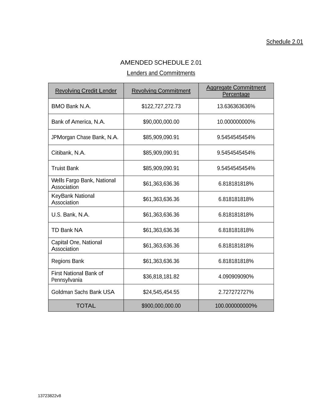 13723822v8 Schedule 2.01 AMENDED SCHEDULE 2.01 Lenders and Commitments Revolving Credit Lender Revolving Commitment Aggregate Commitment Percentage BMO Bank N.A. $122,727,272.73 13.636363636% Bank of America, N.A. $90,000,000.00 10.000000000% JPMorgan Chase Bank, N.A. $85,909,090.91 9.5454545454% Citibank, N.A. $85,909,090.91 9.5454545454% Truist Bank $85,909,090.91 9.5454545454% Wells Fargo Bank, National Association $61,363,636.36 6.818181818% KeyBank National Association $61,363,636.36 6.818181818% U.S. Bank, N.A. $61,363,636.36 6.818181818% TD Bank NA $61,363,636.36 6.818181818% Capital One, National Association $61,363,636.36 6.818181818% Regions Bank $61,363,636.36 6.818181818% First National Bank of Pennsylvania $36,818,181.82 4.090909090% Goldman Sachs Bank USA $24,545,454.55 2.727272727% TOTAL $900,000,000.00 100.000000000%