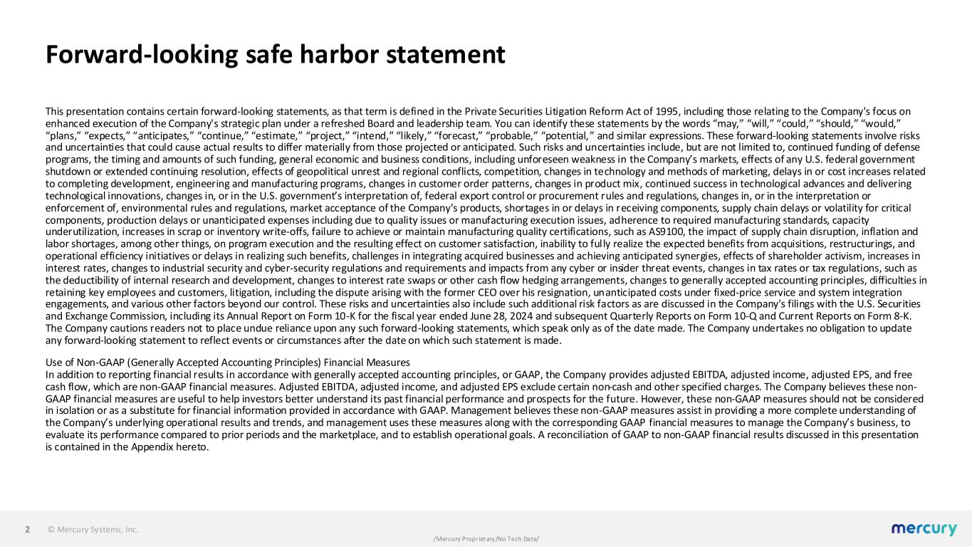 © Mercury Systems, Inc. WEBCAST LOGIN AT WWW.MRCY.COM/INVESTOR WEBCAST REPLAY AVAILABLE BY 7:00 P.M. ET NOVEMBER 5, 2024 Bill Ballhaus Chairman and CEO David Farnsworth Executive Vice President and CFO November 5, 2024, 5:00 pm ET FIRST QUARTER FISCAL YEAR 2025 FINANCIAL RESULTS 1