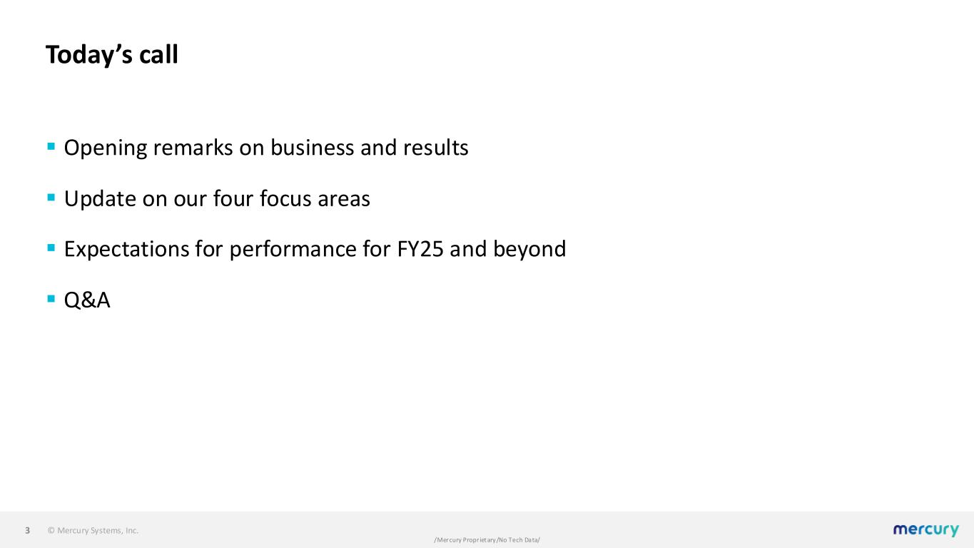 © Mercury Systems, Inc. /Mercury Proprietary/No Tech Data/ Forward-looking safe harbor statement This presentation contains certain forward-looking statements, as that term is defined in the Private Securities Litigation Reform Act of 1995, including those relating to the Company's focus on enhanced execution of the Company's strategic plan under a refreshed Board and leadership team. You can identify these statements by the words “may,” “will,” “could,” “should,” “would,” “plans,” “expects,” “anticipates,” “continue,” “estimate,” “project,” “intend,” “likely,” “forecast,” “probable,” “potential,” and similar expressions. These forward-looking statements involve risks and uncertainties that could cause actual results to differ materially from those projected or anticipated. Such risks and uncertainties include, but are not limited to, continued funding of defense programs, the timing and amounts of such funding, general economic and business conditions, including unforeseen weakness in the Company’s markets, effects of any U.S. federal government shutdown or extended continuing resolution, effects of geopolitical unrest and regional conflicts, competition, changes in technology and methods of marketing, delays in or cost increases related to completing development, engineering and manufacturing programs, changes in customer order patterns, changes in product mix, continued success in technological advances and delivering technological innovations, changes in, or in the U.S. government’s interpretation of, federal export control or procurement rules and regulations, changes in, or in the interpretation or enforcement of, environmental rules and regulations, market acceptance of the Company's products, shortages in or delays in receiving components, supply chain delays or volatility for critical components, production delays or unanticipated expenses including due to quality issues or manufacturing execution issues, adherence to required manufacturing standards, capacity underutilization, increases in scrap or inventory write-offs, failure to achieve or maintain manufacturing quality certifications, such as AS9100, the impact of supply chain disruption, inflation and labor shortages, among other things, on program execution and the resulting effect on customer satisfaction, inability to fully realize the expected benefits from acquisitions, restructurings, and operational efficiency initiatives or delays in realizing such benefits, challenges in integrating acquired businesses and achieving anticipated synergies, effects of shareholder activism, increases in interest rates, changes to industrial security and cyber-security regulations and requirements and impacts from any cyber or insider threat events, changes in tax rates or tax regulations, such as the deductibility of internal research and development, changes to interest rate swaps or other cash flow hedging arrangements, changes to generally accepted accounting principles, difficulties in retaining key employees and customers, litigation, including the dispute arising with the former CEO over his resignation, unanticipated costs under fixed-price service and system integration engagements, and various other factors beyond our control. These risks and uncertainties also include such additional risk factors as are discussed in the Company's filings with the U.S. Securities and Exchange Commission, including its Annual Report on Form 10-K for the fiscal year ended June 28, 2024 and subsequent Quarterly Reports on Form 10-Q and Current Reports on Form 8-K. The Company cautions readers not to place undue reliance upon any such forward-looking statements, which speak only as of the date made. The Company undertakes no obligation to update any forward-looking statement to reflect events or circumstances after the date on which such statement is made. Use of Non-GAAP (Generally Accepted Accounting Principles) Financial Measures In addition to reporting financial results in accordance with generally accepted accounting principles, or GAAP, the Company provides adjusted EBITDA, adjusted income, adjusted EPS, and free cash flow, which are non-GAAP financial measures. Adjusted EBITDA, adjusted income, and adjusted EPS exclude certain non-cash and other specified charges. The Company believes these non- GAAP financial measures are useful to help investors better understand its past financial performance and prospects for the future. However, these non-GAAP measures should not be considered in isolation or as a substitute for financial information provided in accordance with GAAP. Management believes these non-GAAP measures assist in providing a more complete understanding of the Company’s underlying operational results and trends, and management uses these measures along with the corresponding GAAP financial measures to manage the Company’s business, to evaluate its performance compared to prior periods and the marketplace, and to establish operational goals. A reconciliation of GAAP to non-GAAP financial results discussed in this presentation is contained in the Appendix hereto. 2
