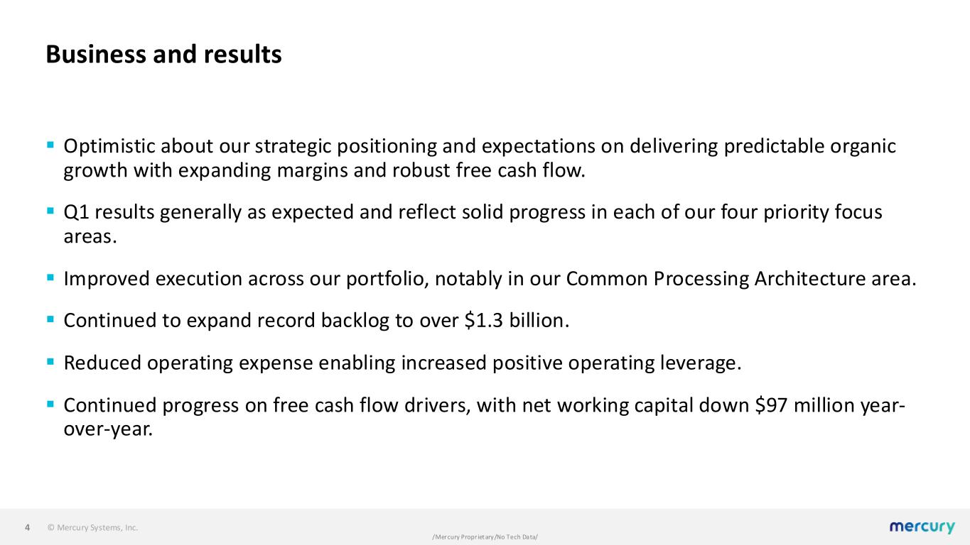 © Mercury Systems, Inc. /Mercury Proprietary/No Tech Data/ Today’s call ▪ Opening remarks on business and results ▪ Update on our four focus areas ▪ Expectations for performance for FY25 and beyond ▪ Q&A 3