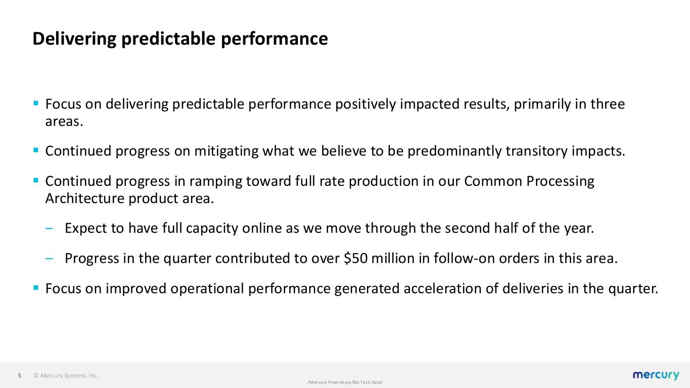 © Mercury Systems, Inc. /Mercury Proprietary/No Tech Data/ Business and results ▪ Optimistic about our strategic positioning and expectations on delivering predictable organic growth with expanding margins and robust free cash flow. ▪ Q1 results generally as expected and reflect solid progress in each of our four priority focus areas. ▪ Improved execution across our portfolio, notably in our Common Processing Architecture area. ▪ Continued to expand record backlog to over $1.3 billion. ▪ Reduced operating expense enabling increased positive operating leverage. ▪ Continued progress on free cash flow drivers, with net working capital down $97 million year- over-year. 4