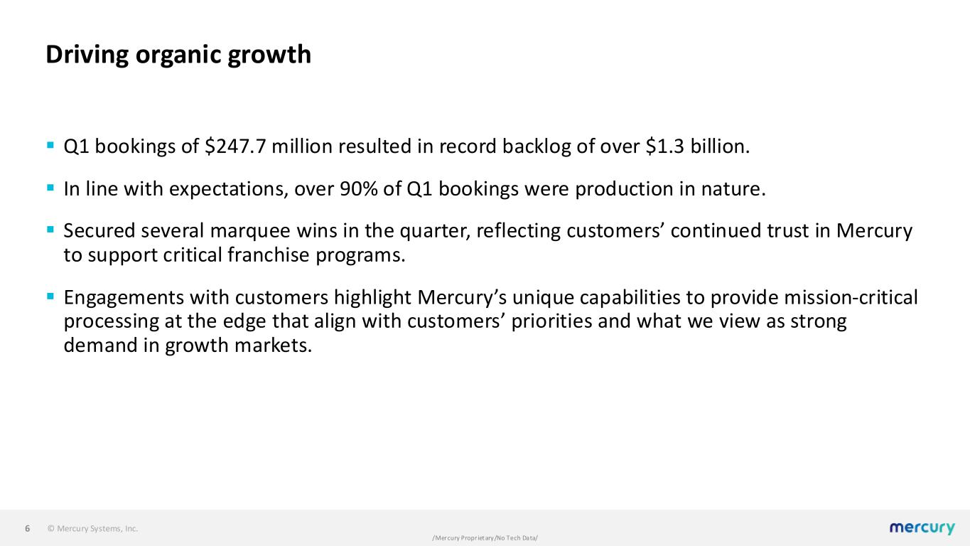 © Mercury Systems, Inc. /Mercury Proprietary/No Tech Data/ Delivering predictable performance ▪ Focus on delivering predictable performance positively impacted results, primarily in three areas. ▪ Continued progress on mitigating what we believe to be predominantly transitory impacts. ▪ Continued progress in ramping toward full rate production in our Common Processing Architecture product area. ‒ Expect to have full capacity online as we move through the second half of the year. ‒ Progress in the quarter contributed to over $50 million in follow-on orders in this area. ▪ Focus on improved operational performance generated acceleration of deliveries in the quarter. 5