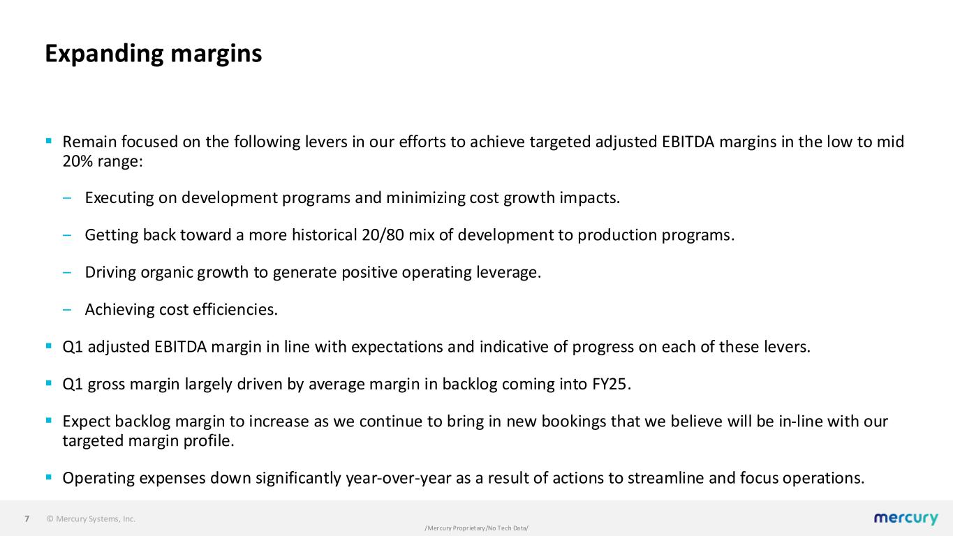 © Mercury Systems, Inc. /Mercury Proprietary/No Tech Data/ Driving organic growth ▪ Q1 bookings of $247.7 million resulted in record backlog of over $1.3 billion. ▪ In line with expectations, over 90% of Q1 bookings were production in nature. ▪ Secured several marquee wins in the quarter, reflecting customers’ continued trust in Mercury to support critical franchise programs. ▪ Engagements with customers highlight Mercury’s unique capabilities to provide mission-critical processing at the edge that align with customers’ priorities and what we view as strong demand in growth markets. 6
