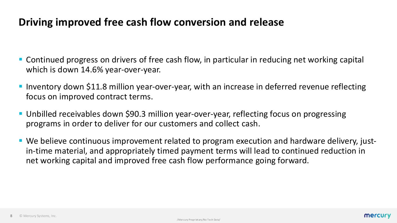 © Mercury Systems, Inc. /Mercury Proprietary/No Tech Data/ Expanding margins ▪ Remain focused on the following levers in our efforts to achieve targeted adjusted EBITDA margins in the low to mid 20% range: ‒ Executing on development programs and minimizing cost growth impacts. ‒ Getting back toward a more historical 20/80 mix of development to production programs. ‒ Driving organic growth to generate positive operating leverage. ‒ Achieving cost efficiencies. ▪ Q1 adjusted EBITDA margin in line with expectations and indicative of progress on each of these levers. ▪ Q1 gross margin largely driven by average margin in backlog coming into FY25. ▪ Expect backlog margin to increase as we continue to bring in new bookings that we believe will be in-line with our targeted margin profile. ▪ Operating expenses down significantly year-over-year as a result of actions to streamline and focus operations. 7