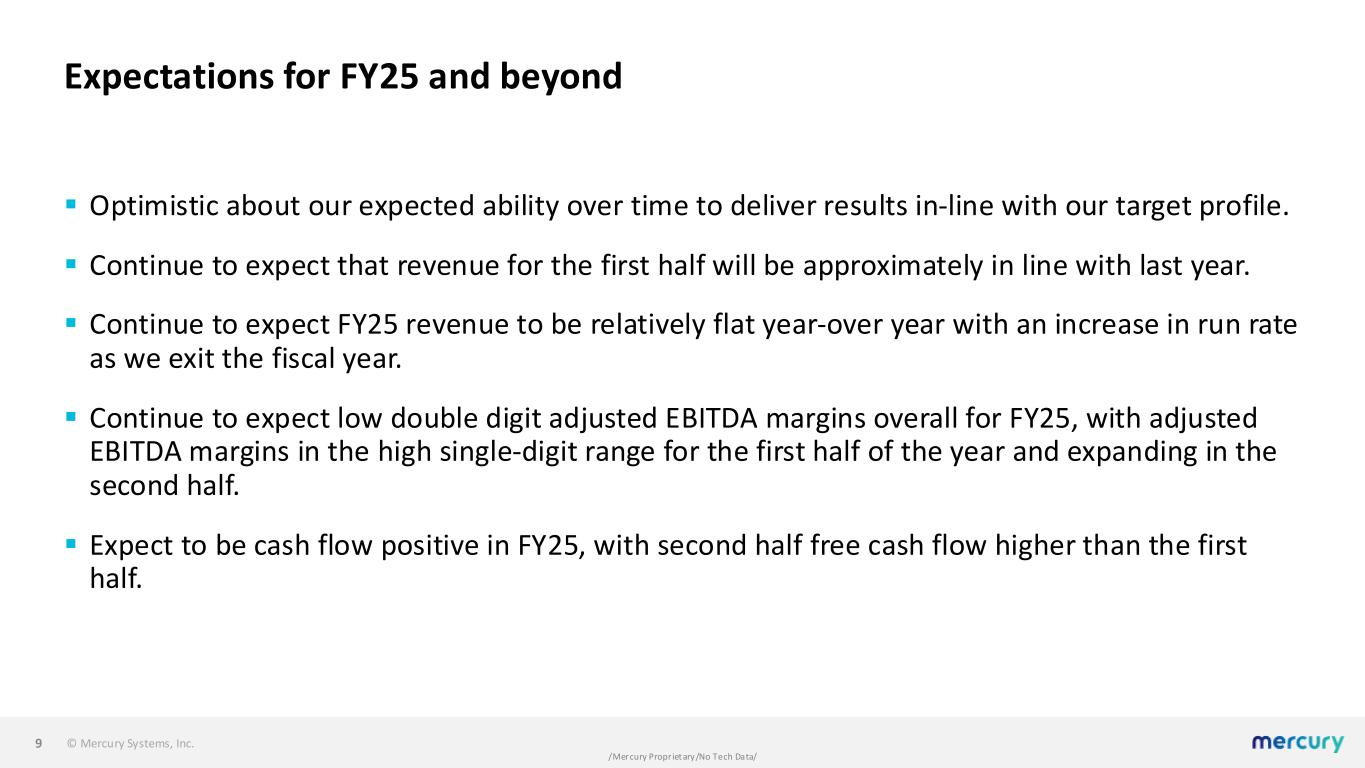 © Mercury Systems, Inc. /Mercury Proprietary/No Tech Data/ Driving improved free cash flow conversion and release ▪ Continued progress on drivers of free cash flow, in particular in reducing net working capital which is down 14.6% year-over-year. ▪ Inventory down $11.8 million year-over-year, with an increase in deferred revenue reflecting focus on improved contract terms. ▪ Unbilled receivables down $90.3 million year-over-year, reflecting focus on progressing programs in order to deliver for our customers and collect cash. ▪ We believe continuous improvement related to program execution and hardware delivery, just- in-time material, and appropriately timed payment terms will lead to continued reduction in net working capital and improved free cash flow performance going forward. 8