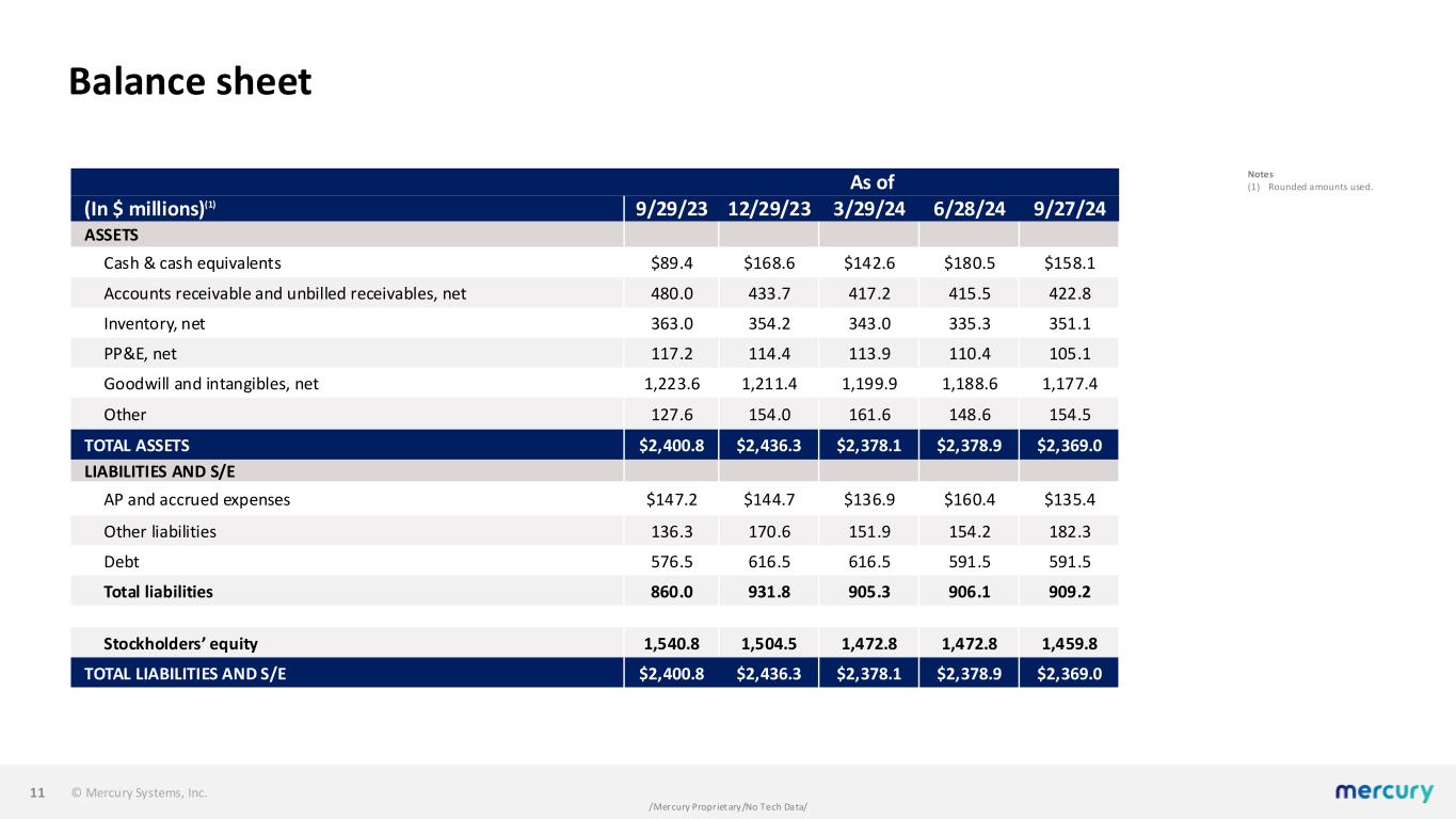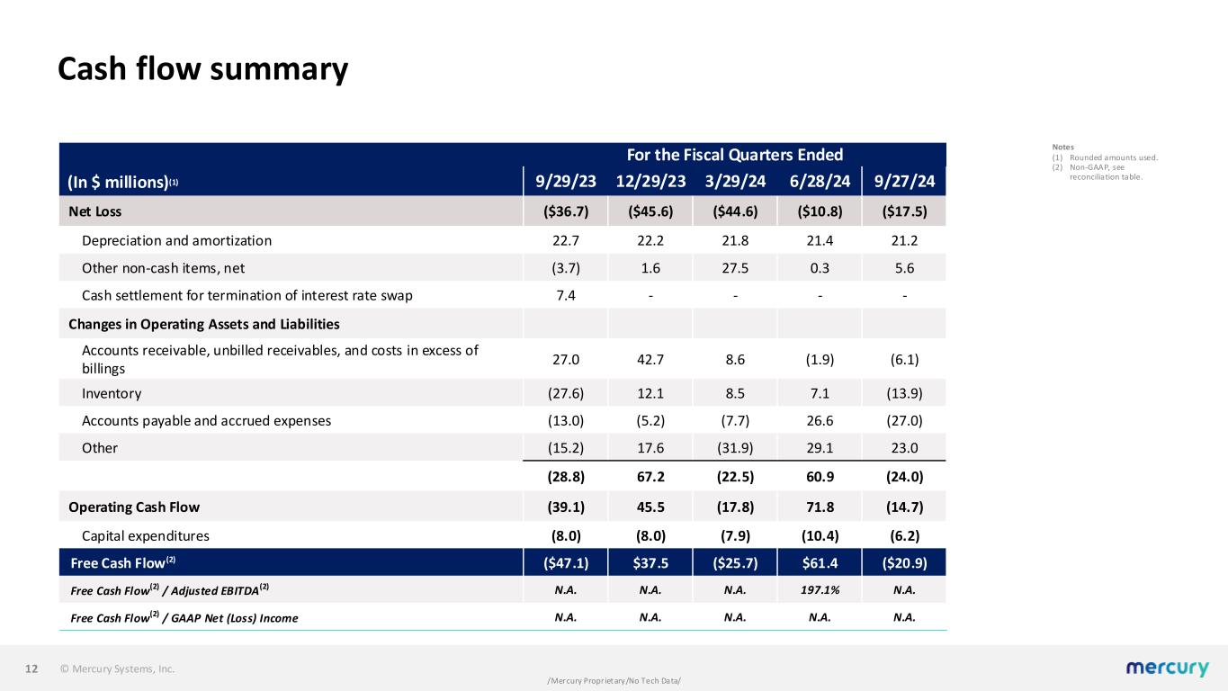 © Mercury Systems, Inc. /Mercury Proprietary/No Tech Data/ Balance sheet 11 As of (In $ millions)(1) 9/29/23 12/29/23 3/29/24 6/28/24 9/27/24 ASSETS Cash & cash equivalents $89.4 $168.6 $142.6 $180.5 $158.1 Accounts receivable and unbilled receivables, net 480.0 433.7 417.2 415.5 422.8 Inventory, net 363.0 354.2 343.0 335.3 351.1 PP&E, net 117.2 114.4 113.9 110.4 105.1 Goodwill and intangibles, net 1,223.6 1,211.4 1,199.9 1,188.6 1,177.4 Other 127.6 154.0 161.6 148.6 154.5 TOTAL ASSETS $2,400.8 $2,436.3 $2,378.1 $2,378.9 $2,369.0 LIABILITIES AND S/E AP and accrued expenses $147.2 $144.7 $136.9 $160.4 $135.4 Other liabilities 136.3 170.6 151.9 154.2 182.3 Debt 576.5 616.5 616.5 591.5 591.5 Total liabilities 860.0 931.8 905.3 906.1 909.2 Stockholders’ equity 1,540.8 1,504.5 1,472.8 1,472.8 1,459.8 TOTAL LIABILITIES AND S/E $2,400.8 $2,436.3 $2,378.1 $2,378.9 $2,369.0 Notes (1) Rounded amounts used.