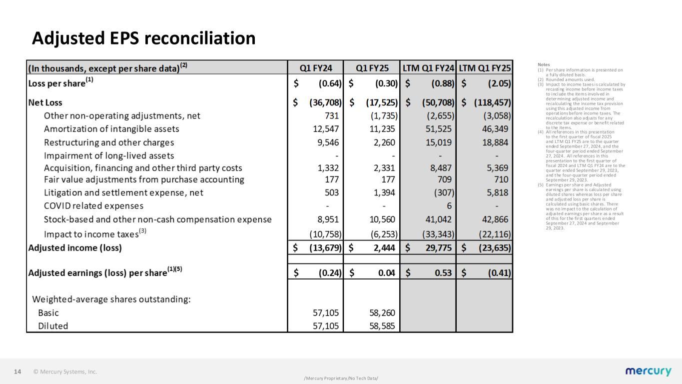© Mercury Systems, Inc. /Mercury Proprietary/No Tech Data/ Cash flow summary 12 Notes (1) Rounded amounts used. (2) Non-GAAP, see reconciliation table. For the Fiscal Quarters Ended (In $ millions)(1) 9/29/23 12/29/23 3/29/24 6/28/24 9/27/24 Net Loss ($36.7) ($45.6) ($44.6) ($10.8) ($17.5) Depreciation and amortization 22.7 22.2 21.8 21.4 21.2 Other non-cash items, net (3.7) 1.6 27.5 0.3 5.6 Cash settlement for termination of interest rate swap 7.4 - - - - Changes in Operating Assets and Liabilities Accounts receivable, unbilled receivables, and costs in excess of billings 27.0 42.7 8.6 (1.9) (6.1) Inventory (27.6) 12.1 8.5 7.1 (13.9) Accounts payable and accrued expenses (13.0) (5.2) (7.7) 26.6 (27.0) Other (15.2) 17.6 (31.9) 29.1 23.0 (28.8) 67.2 (22.5) 60.9 (24.0) Operating Cash Flow (39.1) 45.5 (17.8) 71.8 (14.7) Capital expenditures (8.0) (8.0) (7.9) (10.4) (6.2) Free Cash Flow(2) ($47.1) $37.5 ($25.7) $61.4 ($20.9) Free Cash Flow(2) / Adjusted EBITDA(2) N.A. N.A. N.A. 197.1% N.A. Free Cash Flow(2) / GAAP Net (Loss) Income N.A. N.A. N.A. N.A. N.A.