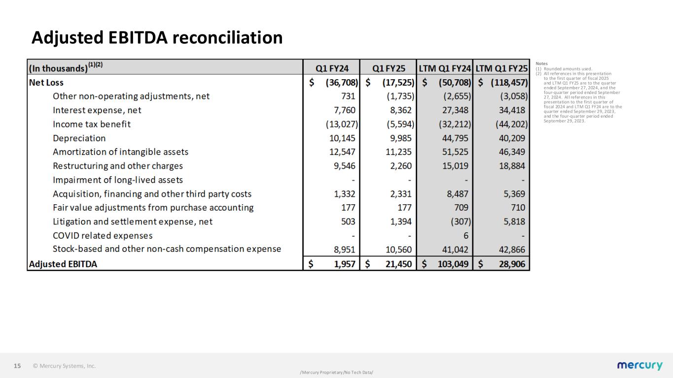 © Mercury Systems, Inc. /Mercury Proprietary/No Tech Data/ Adjusted EPS reconciliation 14 Notes (1) Per share informat ion is presented on a ful ly diluted basis. (2) Rounded amounts used. (3) Impact to income taxes i s calculated by recasting income before income taxes to include the items involved in determining adjusted income and recalculating the income tax provision using this adjusted income from operat ions before income taxes. The recalculation also adjusts for any discrete tax expense or benefi t related to the items. (4) Al l references in this presentation to the first quarter of fiscal 2025 and LTM Q1 FY25 are to the quarter ended September 27, 2024, and the four-quarter period ended September 27, 2024. Al l references in this presentation to the first quarter of fiscal 2024 and LTM Q1 FY24 are to the quarter ended September 29, 2023, and the four-quarter period ended September 29, 2023. (5) Earnings per share and Adjusted earnings per share is calculated using diluted shares whereas loss per share and adjusted loss per share is calculated using basic shares. There was no impact to the calculation of adjusted earnings per share as a result of this for the first quarters ended September 27, 2024 and September 29, 2023.