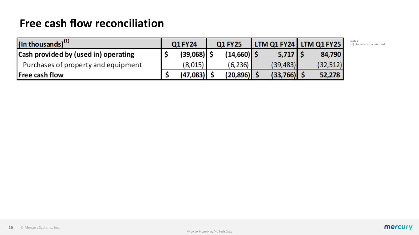 © Mercury Systems, Inc. /Mercury Proprietary/No Tech Data/ Adjusted EBITDA reconciliation 15 Notes (1) Rounded amounts used. (2) Al l references in this presentation to the first quarter of fiscal 2025 and LTM Q1 FY25 are to the quarter ended September 27, 2024, and the four-quarter period ended September 27, 2024. Al l references in this presentation to the first quarter of fiscal 2024 and LTM Q1 FY24 are to the quarter ended September 29, 2023, and the four-quarter period ended September 29, 2023.