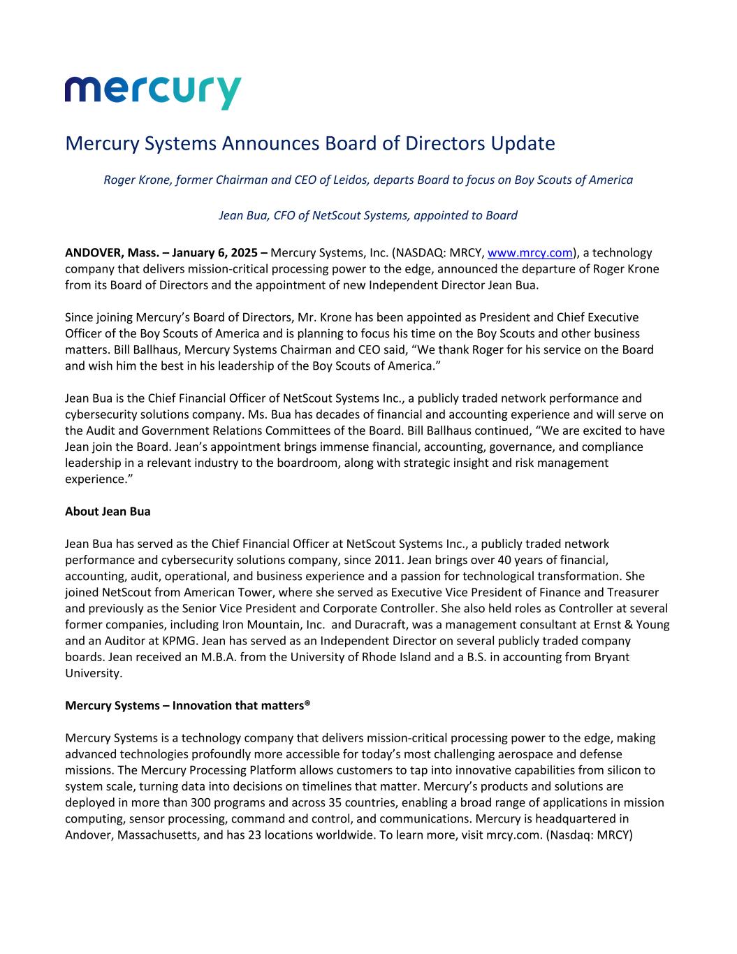 Mercury Systems Announces Board of Directors Update Roger Krone, former Chairman and CEO of Leidos, departs Board to focus on Boy Scouts of America Jean Bua, CFO of NetScout Systems, appointed to Board ANDOVER, Mass. – January 6, 2025 – Mercury Systems, Inc. (NASDAQ: MRCY, www.mrcy.com), a technology company that delivers mission-critical processing power to the edge, announced the departure of Roger Krone from its Board of Directors and the appointment of new Independent Director Jean Bua. Since joining Mercury’s Board of Directors, Mr. Krone has been appointed as President and Chief Executive Officer of the Boy Scouts of America and is planning to focus his time on the Boy Scouts and other business matters. Bill Ballhaus, Mercury Systems Chairman and CEO said, “We thank Roger for his service on the Board and wish him the best in his leadership of the Boy Scouts of America.” Jean Bua is the Chief Financial Officer of NetScout Systems Inc., a publicly traded network performance and cybersecurity solutions company. Ms. Bua has decades of financial and accounting experience and will serve on the Audit and Government Relations Committees of the Board. Bill Ballhaus continued, “We are excited to have Jean join the Board. Jean’s appointment brings immense financial, accounting, governance, and compliance leadership in a relevant industry to the boardroom, along with strategic insight and risk management experience.” About Jean Bua Jean Bua has served as the Chief Financial Officer at NetScout Systems Inc., a publicly traded network performance and cybersecurity solutions company, since 2011. Jean brings over 40 years of financial, accounting, audit, operational, and business experience and a passion for technological transformation. She joined NetScout from American Tower, where she served as Executive Vice President of Finance and Treasurer and previously as the Senior Vice President and Corporate Controller. She also held roles as Controller at several former companies, including Iron Mountain, Inc. and Duracraft, was a management consultant at Ernst & Young and an Auditor at KPMG. Jean has served as an Independent Director on several publicly traded company boards. Jean received an M.B.A. from the University of Rhode Island and a B.S. in accounting from Bryant University. Mercury Systems – Innovation that matters® Mercury Systems is a technology company that delivers mission-critical processing power to the edge, making advanced technologies profoundly more accessible for today’s most challenging aerospace and defense missions. The Mercury Processing Platform allows customers to tap into innovative capabilities from silicon to system scale, turning data into decisions on timelines that matter. Mercury’s products and solutions are deployed in more than 300 programs and across 35 countries, enabling a broad range of applications in mission computing, sensor processing, command and control, and communications. Mercury is headquartered in Andover, Massachusetts, and has 23 locations worldwide. To learn more, visit mrcy.com. (Nasdaq: MRCY)