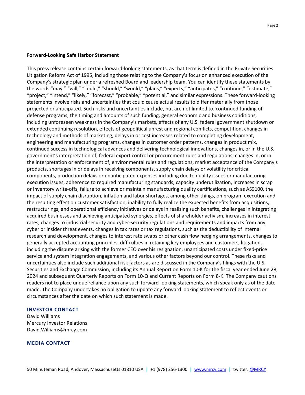 Page 2 50 Minuteman Road, Andover, Massachusetts 01810 USA | +1 (978) 256-1300 | www.mrcy.com | twitter: @MRCY Forward-Looking Safe Harbor Statement This press release contains certain forward-looking statements, as that term is defined in the Private Securities Litigation Reform Act of 1995, including those relating to the Company's focus on enhanced execution of the Company's strategic plan under a refreshed Board and leadership team. You can identify these statements by the words “may,” “will,” “could,” “should,” “would,” “plans,” “expects,” “anticipates,” “continue,” “estimate,” “project,” “intend,” “likely,” “forecast,” “probable,” “potential,” and similar expressions. These forward-looking statements involve risks and uncertainties that could cause actual results to differ materially from those projected or anticipated. Such risks and uncertainties include, but are not limited to, continued funding of defense programs, the timing and amounts of such funding, general economic and business conditions, including unforeseen weakness in the Company’s markets, effects of any U.S. federal government shutdown or extended continuing resolution, effects of geopolitical unrest and regional conflicts, competition, changes in technology and methods of marketing, delays in or cost increases related to completing development, engineering and manufacturing programs, changes in customer order patterns, changes in product mix, continued success in technological advances and delivering technological innovations, changes in, or in the U.S. government’s interpretation of, federal export control or procurement rules and regulations, changes in, or in the interpretation or enforcement of, environmental rules and regulations, market acceptance of the Company's products, shortages in or delays in receiving components, supply chain delays or volatility for critical components, production delays or unanticipated expenses including due to quality issues or manufacturing execution issues, adherence to required manufacturing standards, capacity underutilization, increases in scrap or inventory write-offs, failure to achieve or maintain manufacturing quality certifications, such as AS9100, the impact of supply chain disruption, inflation and labor shortages, among other things, on program execution and the resulting effect on customer satisfaction, inability to fully realize the expected benefits from acquisitions, restructurings, and operational efficiency initiatives or delays in realizing such benefits, challenges in integrating acquired businesses and achieving anticipated synergies, effects of shareholder activism, increases in interest rates, changes to industrial security and cyber-security regulations and requirements and impacts from any cyber or insider threat events, changes in tax rates or tax regulations, such as the deductibility of internal research and development, changes to interest rate swaps or other cash flow hedging arrangements, changes to generally accepted accounting principles, difficulties in retaining key employees and customers, litigation, including the dispute arising with the former CEO over his resignation, unanticipated costs under fixed-price service and system integration engagements, and various other factors beyond our control. These risks and uncertainties also include such additional risk factors as are discussed in the Company's filings with the U.S. Securities and Exchange Commission, including its Annual Report on Form 10-K for the fiscal year ended June 28, 2024 and subsequent Quarterly Reports on Form 10-Q and Current Reports on Form 8-K. The Company cautions readers not to place undue reliance upon any such forward-looking statements, which speak only as of the date made. The Company undertakes no obligation to update any forward looking statement to reflect events or circumstances after the date on which such statement is made. INVESTOR CONTACT David Williams Mercury Investor Relations David.Williams@mrcy.com MEDIA CONTACT
