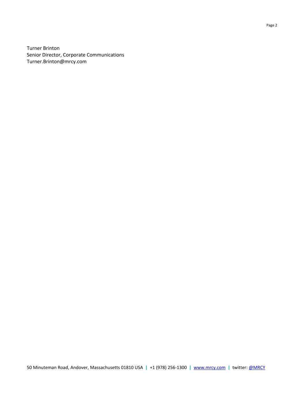 Page 2 50 Minuteman Road, Andover, Massachusetts 01810 USA | +1 (978) 256-1300 | www.mrcy.com | twitter: @MRCY Turner Brinton Senior Director, Corporate Communications Turner.Brinton@mrcy.com