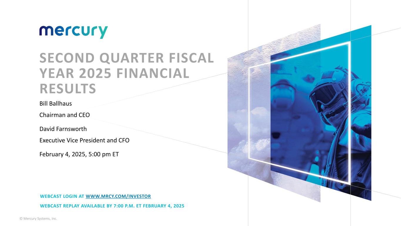 © Mercury Systems, Inc. WEBCAST LOGIN AT WWW.MRCY.COM/INVESTOR WEBCAST REPLAY AVAILABLE BY 7:00 P.M. ET FEBRUARY 4, 2025 Bill Ballhaus Chairman and CEO David Farnsworth Executive Vice President and CFO February 4, 2025, 5:00 pm ET SECOND QUARTER FISCAL YEAR 2025 FINANCIAL RESULTS 1