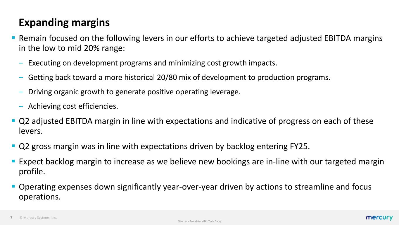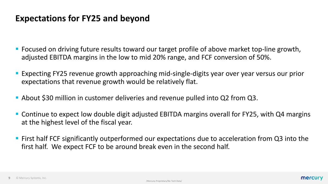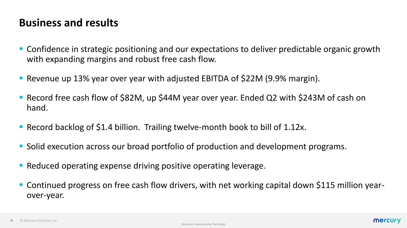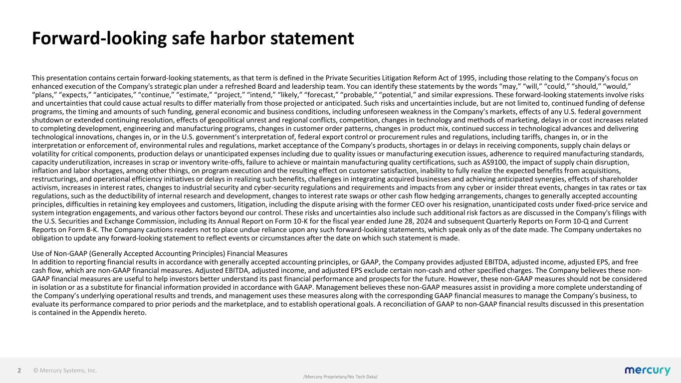 © Mercury Systems, Inc. /Mercury Proprietary/No Tech Data/ Forward-looking safe harbor statement This presentation contains certain forward-looking statements, as that term is defined in the Private Securities Litigation Reform Act of 1995, including those relating to the Company's focus on enhanced execution of the Company's strategic plan under a refreshed Board and leadership team. You can identify these statements by the words “may,” “will,” “could,” “should,” “would,” “plans,” “expects,” “anticipates,” “continue,” “estimate,” “project,” “intend,” “likely,” “forecast,” “probable,” “potential,” and similar expressions. These forward-looking statements involve risks and uncertainties that could cause actual results to differ materially from those projected or anticipated. Such risks and uncertainties include, but are not limited to, continued funding of defense programs, the timing and amounts of such funding, general economic and business conditions, including unforeseen weakness in the Company’s markets, effects of any U.S. federal government shutdown or extended continuing resolution, effects of geopolitical unrest and regional conflicts, competition, changes in technology and methods of marketing, delays in or cost increases related to completing development, engineering and manufacturing programs, changes in customer order patterns, changes in product mix, continued success in technological advances and delivering technological innovations, changes in, or in the U.S. government’s interpretation of, federal export control or procurement rules and regulations, including tariffs, changes in, or in the interpretation or enforcement of, environmental rules and regulations, market acceptance of the Company's products, shortages in or delays in receiving components, supply chain delays or volatility for critical components, production delays or unanticipated expenses including due to quality issues or manufacturing execution issues, adherence to required manufacturing standards, capacity underutilization, increases in scrap or inventory write-offs, failure to achieve or maintain manufacturing quality certifications, such as AS9100, the impact of supply chain disruption, inflation and labor shortages, among other things, on program execution and the resulting effect on customer satisfaction, inability to fully realize the expected benefits from acquisitions, restructurings, and operational efficiency initiatives or delays in realizing such benefits, challenges in integrating acquired businesses and achieving anticipated synergies, effects of shareholder activism, increases in interest rates, changes to industrial security and cyber-security regulations and requirements and impacts from any cyber or insider threat events, changes in tax rates or tax regulations, such as the deductibility of internal research and development, changes to interest rate swaps or other cash flow hedging arrangements, changes to generally accepted accounting principles, difficulties in retaining key employees and customers, litigation, including the dispute arising with the former CEO over his resignation, unanticipated costs under fixed-price service and system integration engagements, and various other factors beyond our control. These risks and uncertainties also include such additional risk factors as are discussed in the Company's filings with the U.S. Securities and Exchange Commission, including its Annual Report on Form 10-K for the fiscal year ended June 28, 2024 and subsequent Quarterly Reports on Form 10-Q and Current Reports on Form 8-K. The Company cautions readers not to place undue reliance upon any such forward-looking statements, which speak only as of the date made. The Company undertakes no obligation to update any forward-looking statement to reflect events or circumstances after the date on which such statement is made. Use of Non-GAAP (Generally Accepted Accounting Principles) Financial Measures In addition to reporting financial results in accordance with generally accepted accounting principles, or GAAP, the Company provides adjusted EBITDA, adjusted income, adjusted EPS, and free cash flow, which are non-GAAP financial measures. Adjusted EBITDA, adjusted income, and adjusted EPS exclude certain non-cash and other specified charges. The Company believes these non- GAAP financial measures are useful to help investors better understand its past financial performance and prospects for the future. However, these non-GAAP measures should not be considered in isolation or as a substitute for financial information provided in accordance with GAAP. Management believes these non-GAAP measures assist in providing a more complete understanding of the Company’s underlying operational results and trends, and management uses these measures along with the corresponding GAAP financial measures to manage the Company’s business, to evaluate its performance compared to prior periods and the marketplace, and to establish operational goals. A reconciliation of GAAP to non-GAAP financial results discussed in this presentation is contained in the Appendix hereto. 2