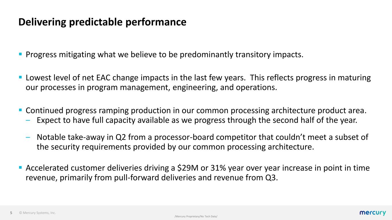 © Mercury Systems, Inc. /Mercury Proprietary/No Tech Data/ Delivering predictable performance ▪ Progress mitigating what we believe to be predominantly transitory impacts. ▪ Lowest level of net EAC change impacts in the last few years. This reflects progress in maturing our processes in program management, engineering, and operations. ▪ Continued progress ramping production in our common processing architecture product area. ‒ Expect to have full capacity available as we progress through the second half of the year. ‒ Notable take-away in Q2 from a processor-board competitor that couldn’t meet a subset of the security requirements provided by our common processing architecture. ▪ Accelerated customer deliveries driving a $29M or 31% year over year increase in point in time revenue, primarily from pull-forward deliveries and revenue from Q3. 5