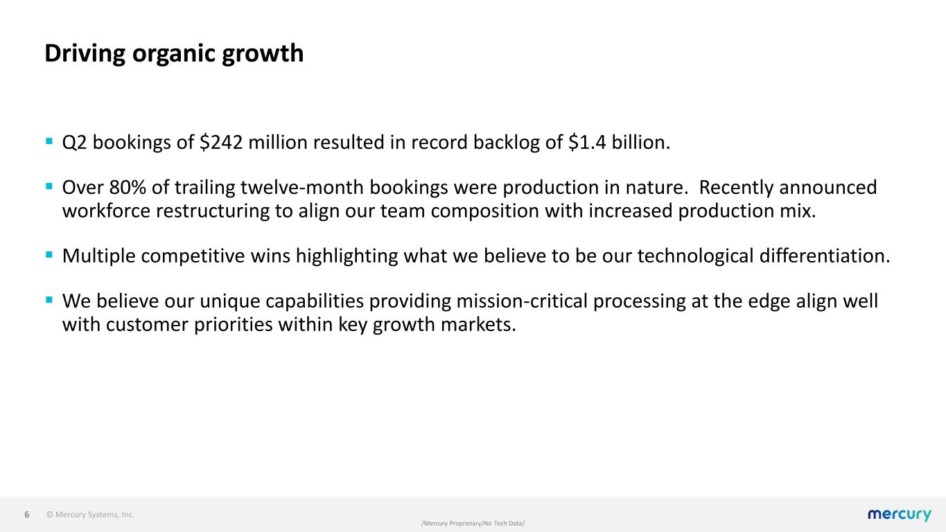 © Mercury Systems, Inc. /Mercury Proprietary/No Tech Data/ Driving organic growth ▪ Q2 bookings of $242 million resulted in record backlog of $1.4 billion. ▪ Over 80% of trailing twelve-month bookings were production in nature. Recently announced workforce restructuring to align our team composition with increased production mix. ▪ Multiple competitive wins highlighting what we believe to be our technological differentiation. ▪ We believe our unique capabilities providing mission-critical processing at the edge align well with customer priorities within key growth markets. 6