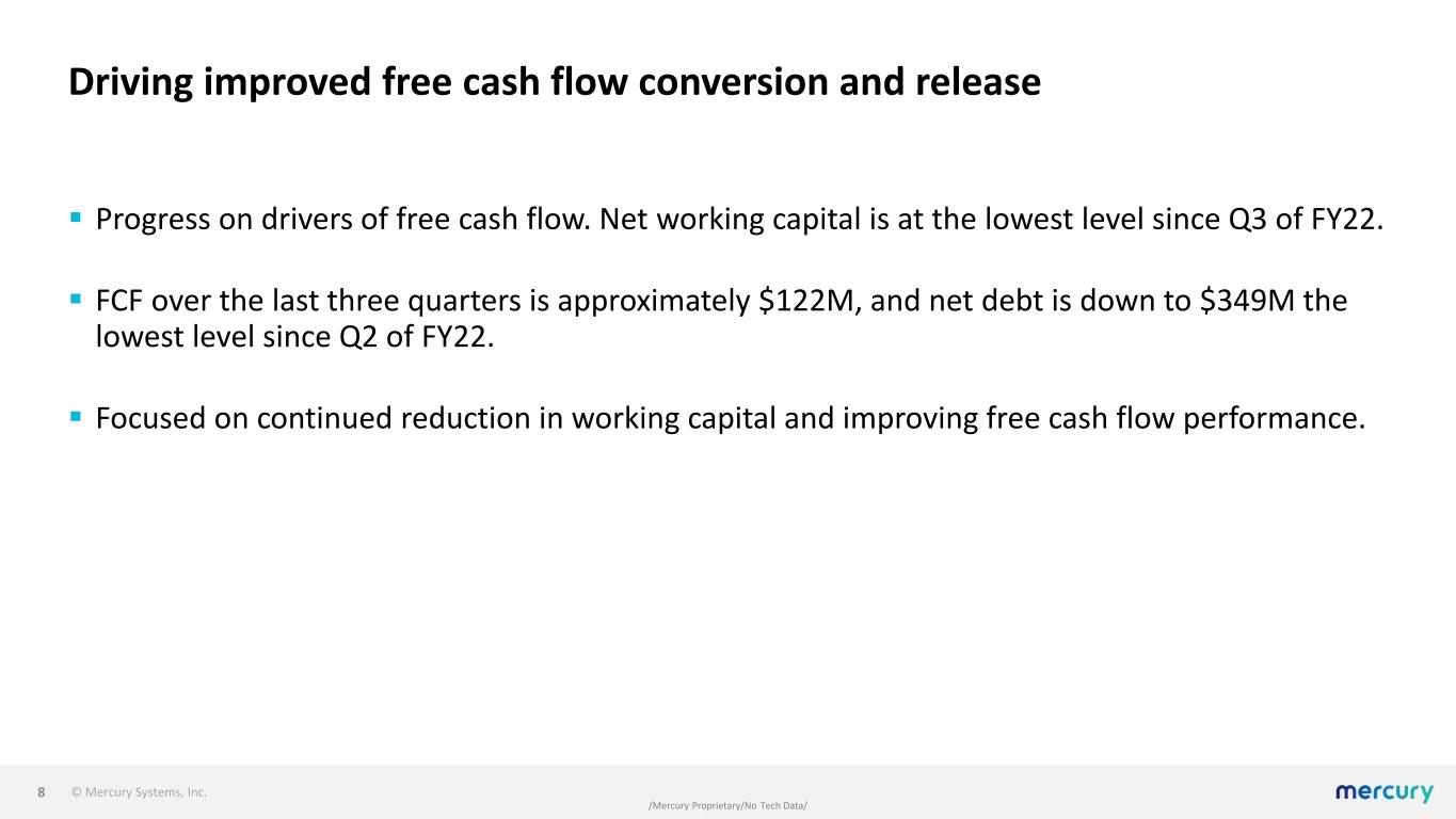 © Mercury Systems, Inc. /Mercury Proprietary/No Tech Data/ Driving improved free cash flow conversion and release ▪ Progress on drivers of free cash flow. Net working capital is at the lowest level since Q3 of FY22. ▪ FCF over the last three quarters is approximately $122M, and net debt is down to $349M the lowest level since Q2 of FY22. ▪ Focused on continued reduction in working capital and improving free cash flow performance. 8