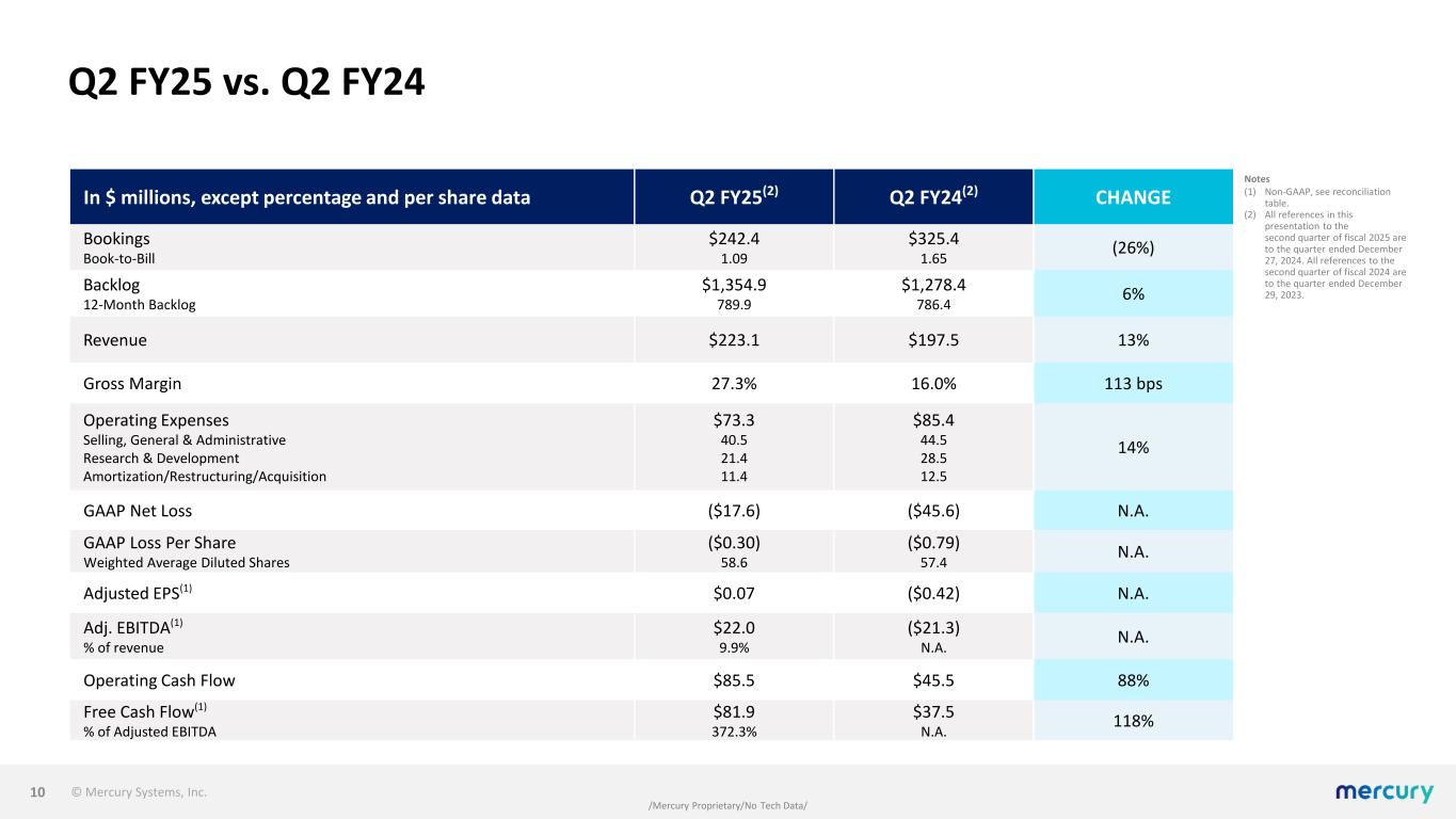 © Mercury Systems, Inc. /Mercury Proprietary/No Tech Data/ Q2 FY25 vs. Q2 FY24 10 In $ millions, except percentage and per share data Q2 FY25(2) Q2 FY24(2) CHANGE Bookings Book-to-Bill $242.4 1.09 $325.4 1.65 (26%) Backlog 12-Month Backlog $1,354.9 789.9 $1,278.4 786.4 6% Revenue $223.1 $197.5 13% Gross Margin 27.3% 16.0% 113 bps Operating Expenses Selling, General & Administrative Research & Development Amortization/Restructuring/Acquisition $73.3 40.5 21.4 11.4 $85.4 44.5 28.5 12.5 14% GAAP Net Loss ($17.6) ($45.6) N.A. GAAP Loss Per Share Weighted Average Diluted Shares ($0.30) 58.6 ($0.79) 57.4 N.A. Adjusted EPS(1) $0.07 ($0.42) N.A. Adj. EBITDA(1) % of revenue $22.0 9.9% ($21.3) N.A. N.A. Operating Cash Flow $85.5 $45.5 88% Free Cash Flow(1) % of Adjusted EBITDA $81.9 372.3% $37.5 N.A. 118% Notes (1) Non-GAAP, see reconciliation table. (2) All references in this presentation to the second quarter of fiscal 2025 are to the quarter ended December 27, 2024. All references to the second quarter of fiscal 2024 are to the quarter ended December 29, 2023.