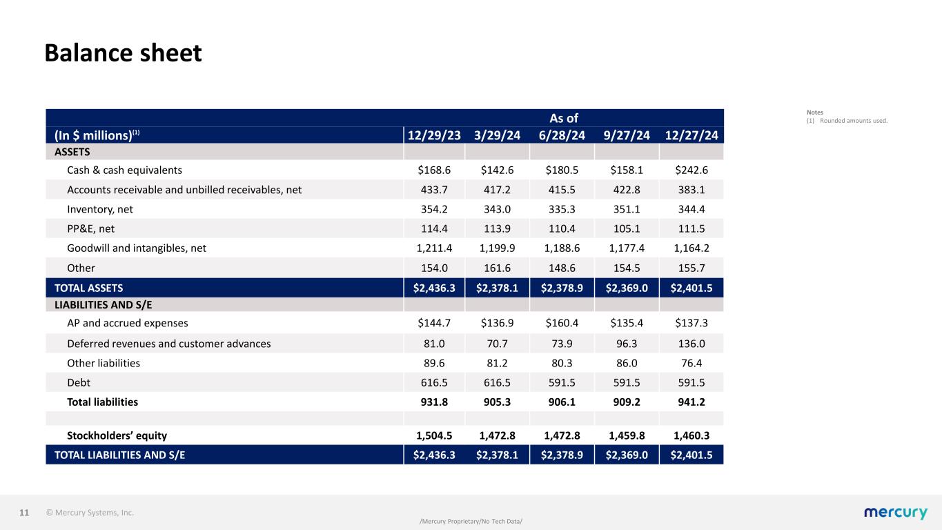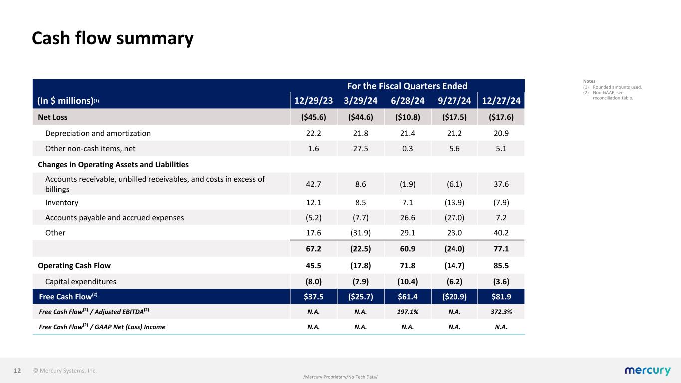 © Mercury Systems, Inc. /Mercury Proprietary/No Tech Data/ Balance sheet 11 As of (In $ millions)(1) 12/29/23 3/29/24 6/28/24 9/27/24 12/27/24 ASSETS Cash & cash equivalents $168.6 $142.6 $180.5 $158.1 $242.6 Accounts receivable and unbilled receivables, net 433.7 417.2 415.5 422.8 383.1 Inventory, net 354.2 343.0 335.3 351.1 344.4 PP&E, net 114.4 113.9 110.4 105.1 111.5 Goodwill and intangibles, net 1,211.4 1,199.9 1,188.6 1,177.4 1,164.2 Other 154.0 161.6 148.6 154.5 155.7 TOTAL ASSETS $2,436.3 $2,378.1 $2,378.9 $2,369.0 $2,401.5 LIABILITIES AND S/E AP and accrued expenses $144.7 $136.9 $160.4 $135.4 $137.3 Deferred revenues and customer advances 81.0 70.7 73.9 96.3 136.0 Other liabilities 89.6 81.2 80.3 86.0 76.4 Debt 616.5 616.5 591.5 591.5 591.5 Total liabilities 931.8 905.3 906.1 909.2 941.2 Stockholders’ equity 1,504.5 1,472.8 1,472.8 1,459.8 1,460.3 TOTAL LIABILITIES AND S/E $2,436.3 $2,378.1 $2,378.9 $2,369.0 $2,401.5 Notes (1) Rounded amounts used.